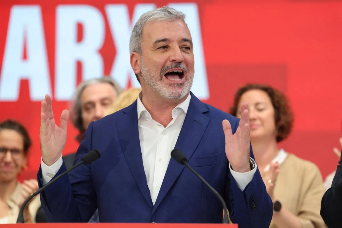 عمدة مدينة برشلونة الحالي جومي كولبوني يتحدث في مقر الحزب الاشتراكي الكتالوني في برشلونة 28 مايو 2023 بعد الانتخابات المحلية والإقليمية التي عقدت في إسبانيا (أ.ف.ب)