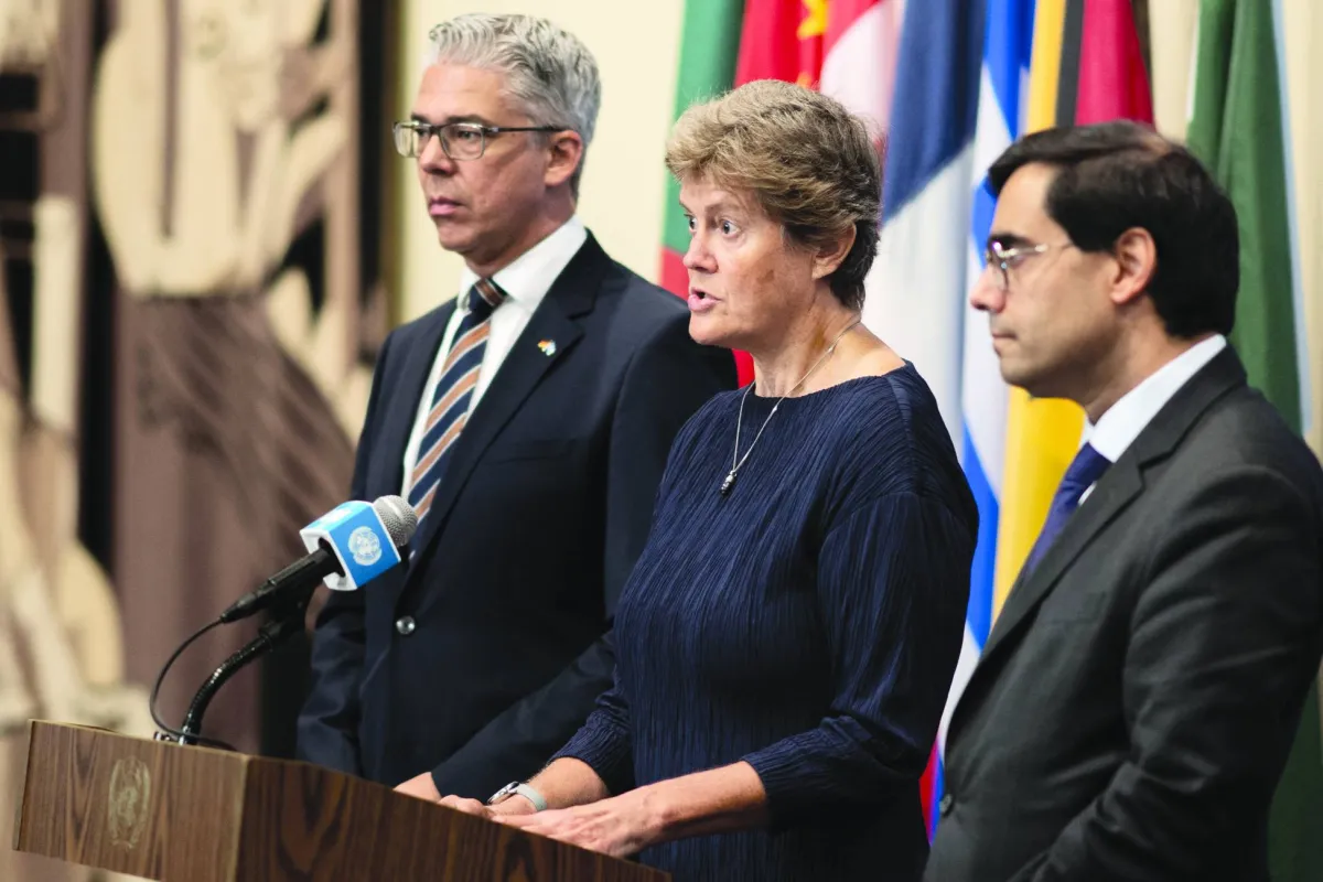 وجاء في بيان مشترك ألقته السفيرة باربرا وودوارد، المندوبة الدائمة للمملكة المتحدة لدى الأمم المتحدة، نيابةً عن فرنسا وألمانيا والمملكة المتحدة، أن إيران «توقفت منذ عام 2019، تدريجياً وبشكل متعمد عن تنفيذ معظم التزاماتها ضمن خطة العمل الشاملة المشتركة»، مشيراً إلى أن ذلك «يشمل تراكم مخزون كبير من اليورانيوم عالي التخصيب، دون أي مبرر مدني موثوق».