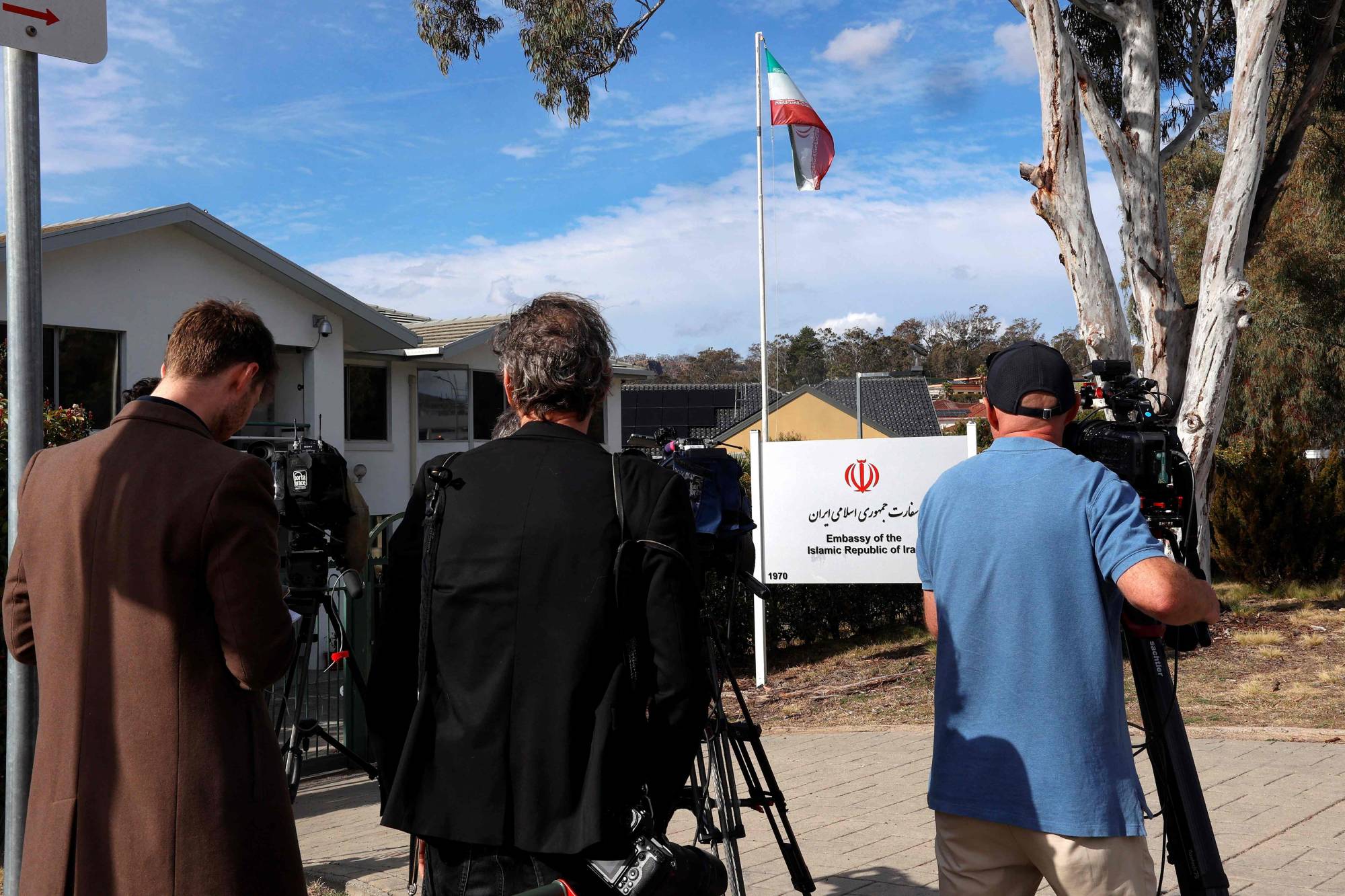 تجمُّع إعلاميين خارج السفارة الإيرانية في كانبيرا خلال تغطية إخبارية يوم 26 أغسطس 2025 (أ.ف.ب)