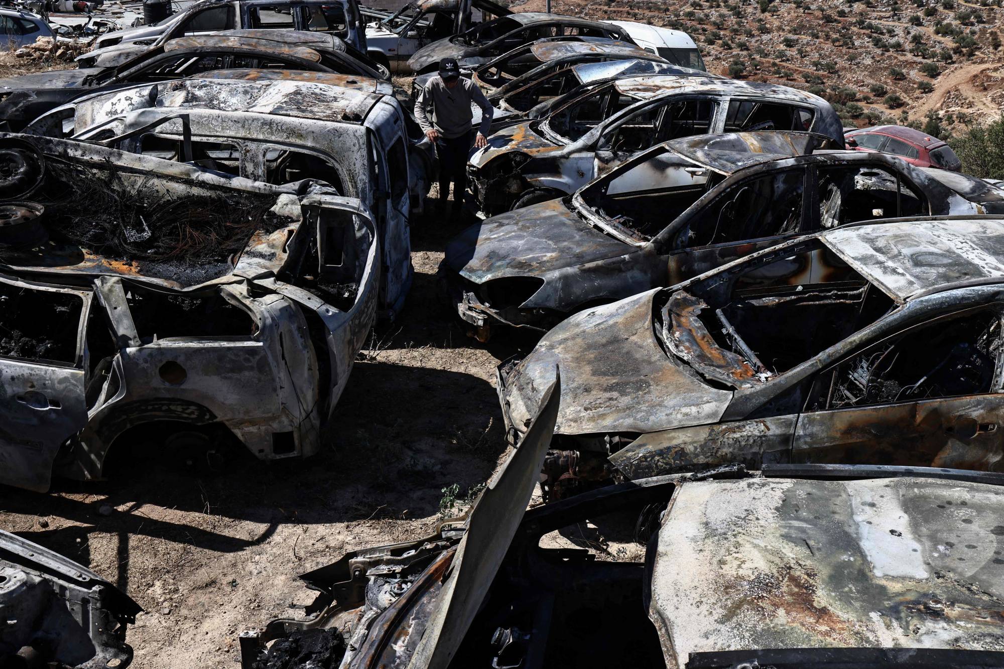 فلسطيني وسط سيارات أحرقها مستوطنون بقرية برقة شرق رام الله يوم 15 يوليو 2025 (أ.ف.ب)