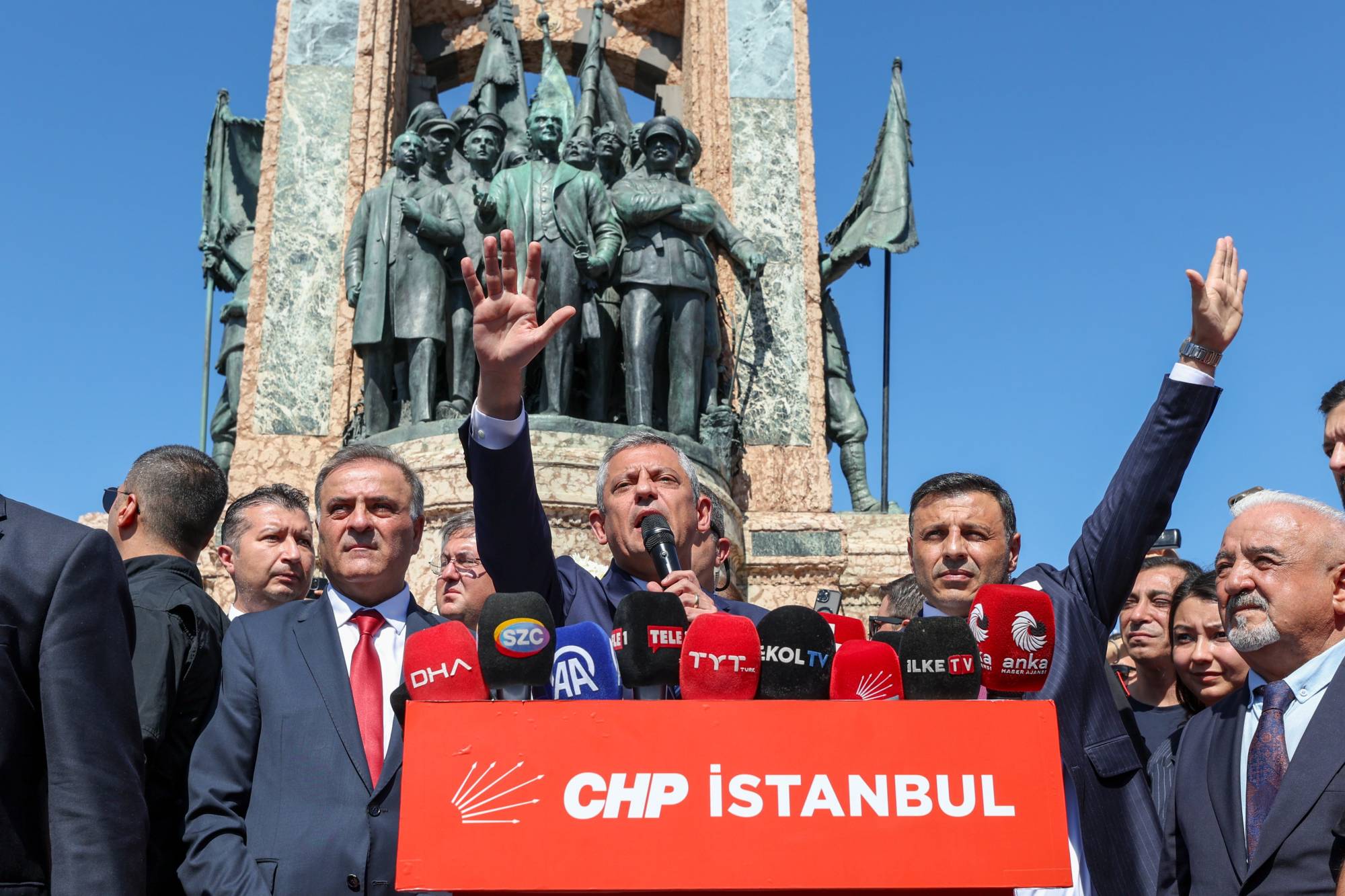 أوزيل متحدثاً وبجواره رئيس فرع «الشعب الجمهوري» في إسطنبول الموقوف بحكم قضائي أوزغور تشيليك خلال الاحتفال بذكرى تأسيس الحزب في ميدان تقسيم (حساب الحزب في «إكس»)