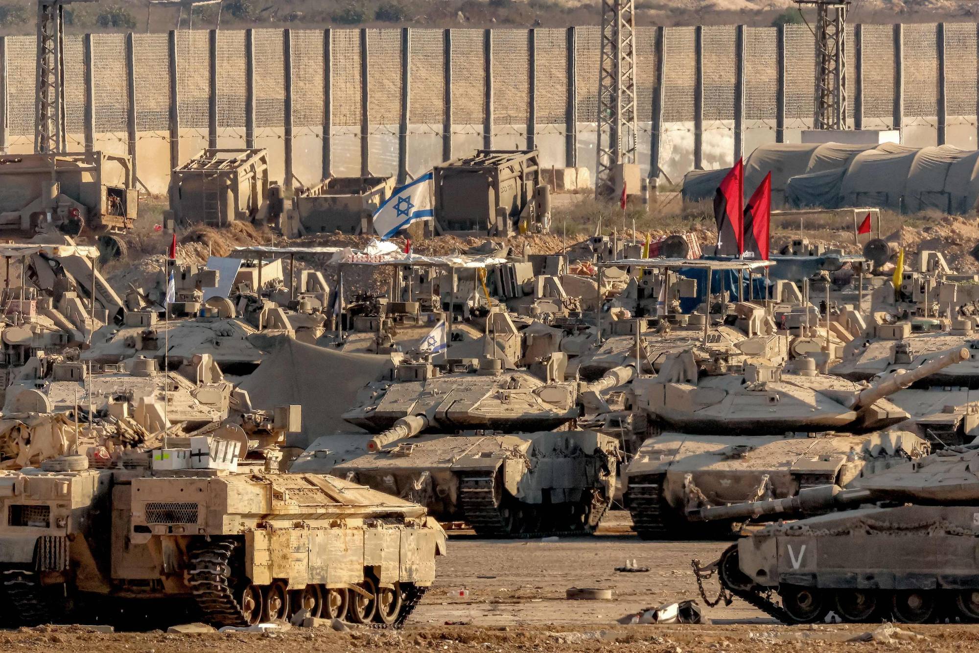 دبابات «ميركافا» في مركز قرب حدود قطاع غزة الجمعة (أ.ف.ب)