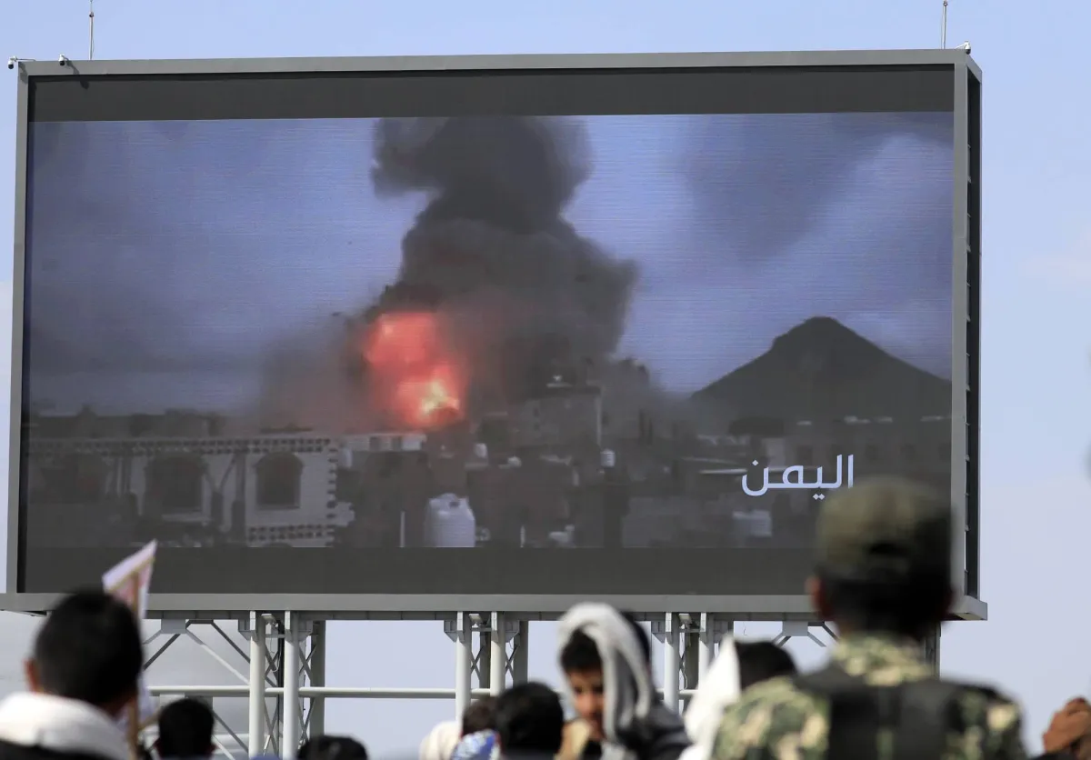 تجمع أنصار الحوثيين أمام لوحة إعلانية رقمية تُظهر انفجارات ناجمة عن الغارات الإسرائيلية الأخيرة على موقع في صنعاء خلال احتجاج ضد إسرائيل في العاصمة (إ.ب.أ)