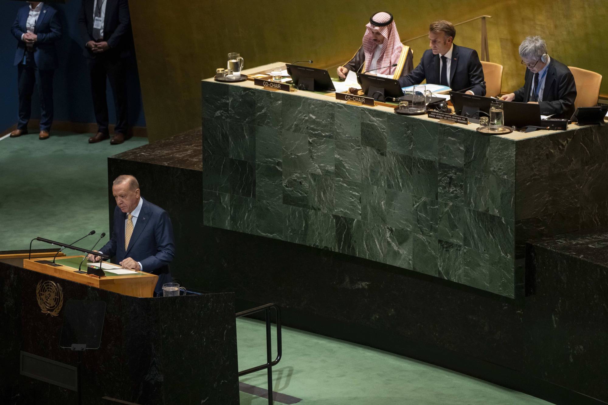 الرئيس التركي رجب طيب إردوغان يلقي كلمة خلال قمة الأمم المتحدة حول القضية الفلسطينية (أ.ف.ب)
