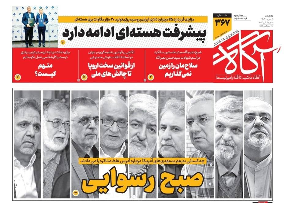 وتحت عنوان «صباح الفضيحة»، هاجمت صحيفة «آكاه» التي تصدر عن «منظمة الدعاية الإسلامية»، مسؤولين ونواباً سابقين وشخصيات في التيار الإصلاحي، من بينهم وزير الخارجية السابق محمد جواد ظريف. واتهمت هؤلاء بـ«تقديم عناوين خاطئة لخوض مفاوضات مع الولايات المتحدة رغم نكث العهود».