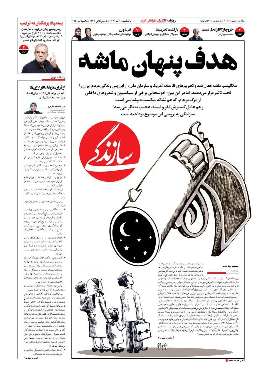 وسلطت صحيفة «سازندكي» تحت عنوان «الهدف الخفي لآلية الزناد»، الضوء على تداعيات الآلية، وقالت إن «العقوبات الجائرة التي تفرضها الولايات المتحدة والأمم المتحدة... في التأثير المباشر على حياة الشعب الإيراني. لكن ما يثير الغرابة هو ابتهاج بعض السياسيين والمتشددين المحليين بانهيار الاتفاق النووي، وهو ما يُعد دليلاً على فشل المسار الدبلوماسي، ويشكّل في الوقت ذاته سبباً في تفشي الفقر والفساد».