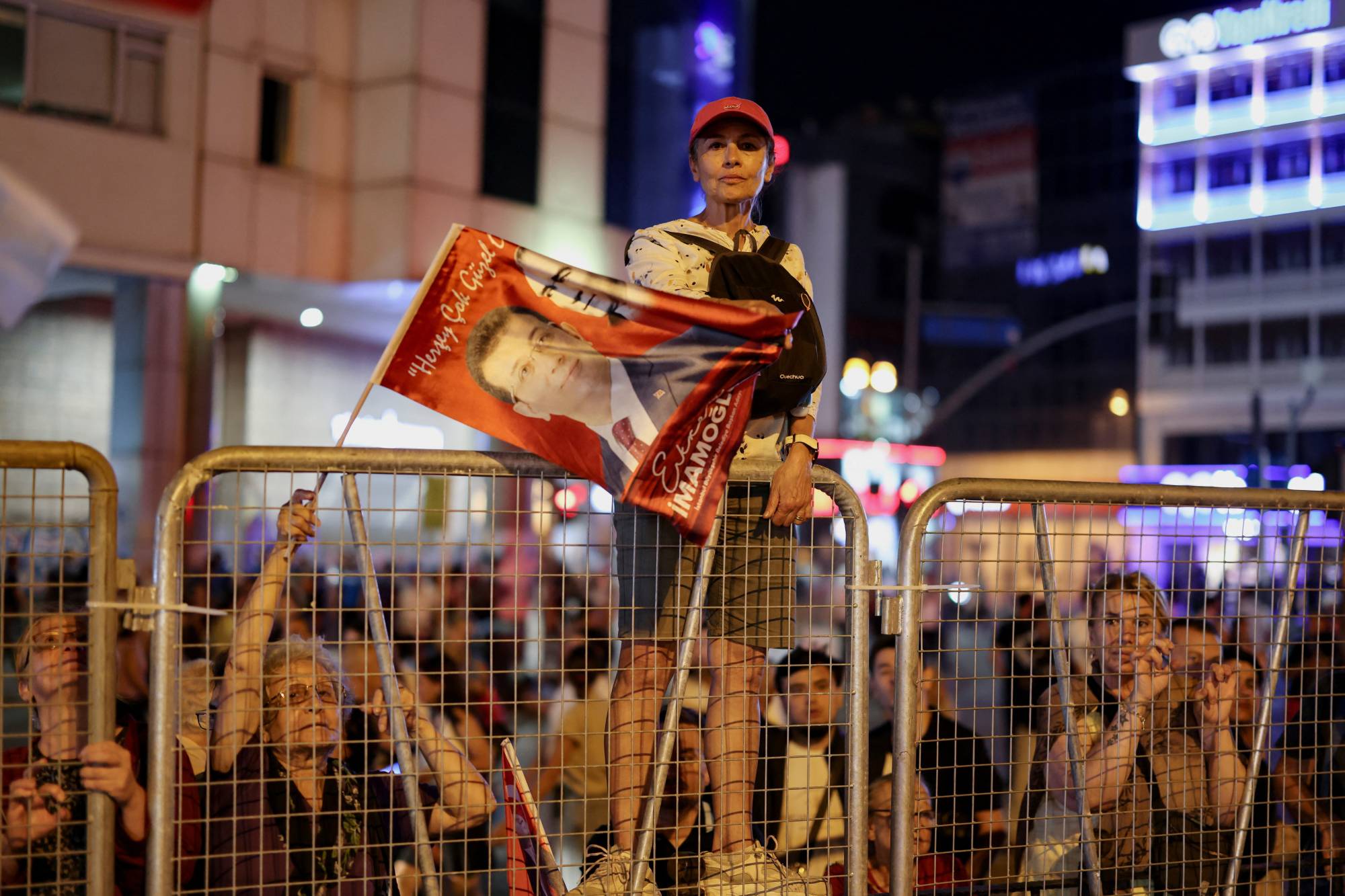 متظاهرة من أنصار حزب «الشعب الجمهوري» ترفع صورة أكرم إمام أوغلو خلال احتجاج على اعتقاله بشبهة فساد (رويترز)