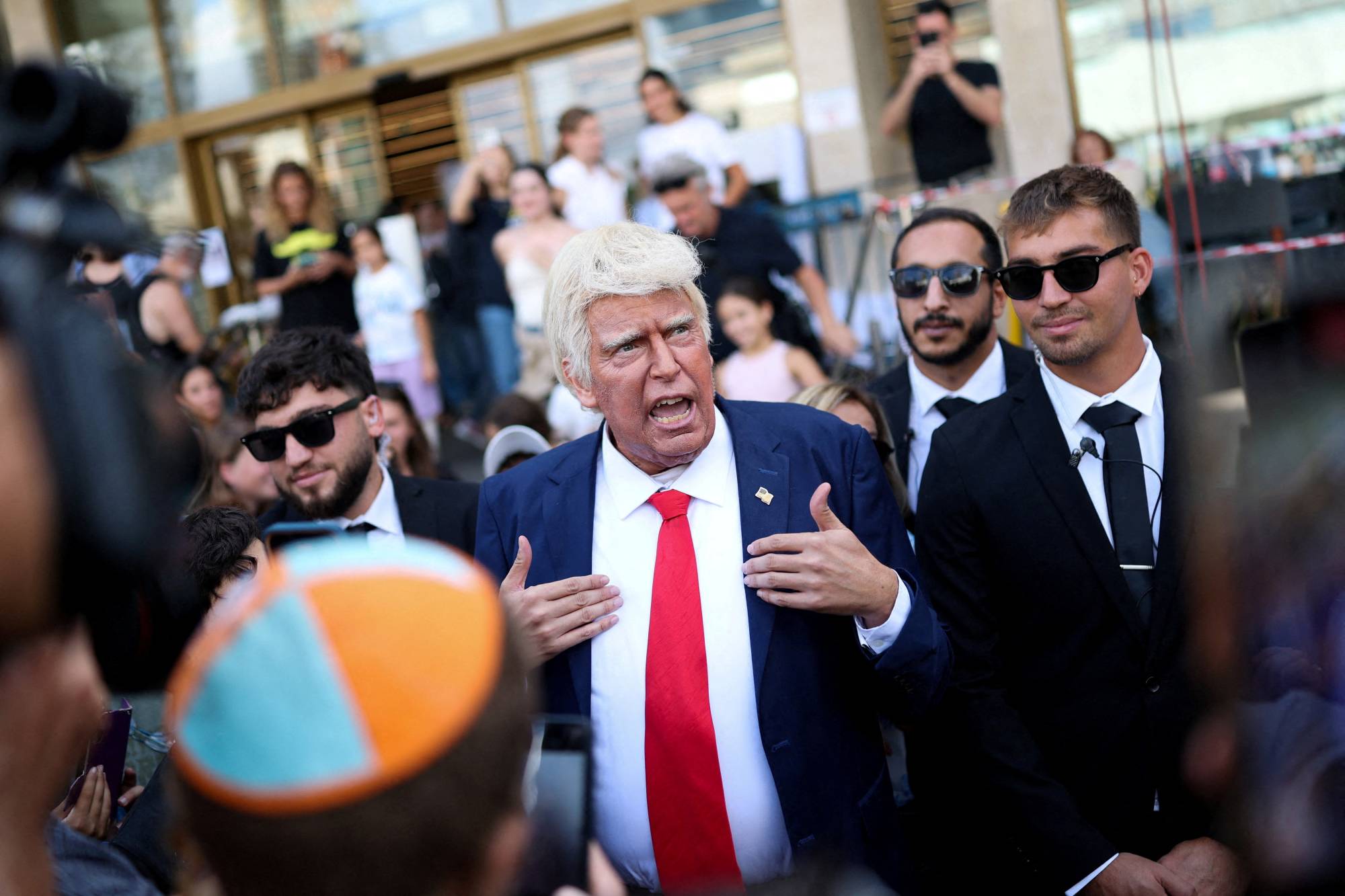 إسرائيلي متنكراً بزي ترمب خلال مظاهرة تل أبيب (رويترز)