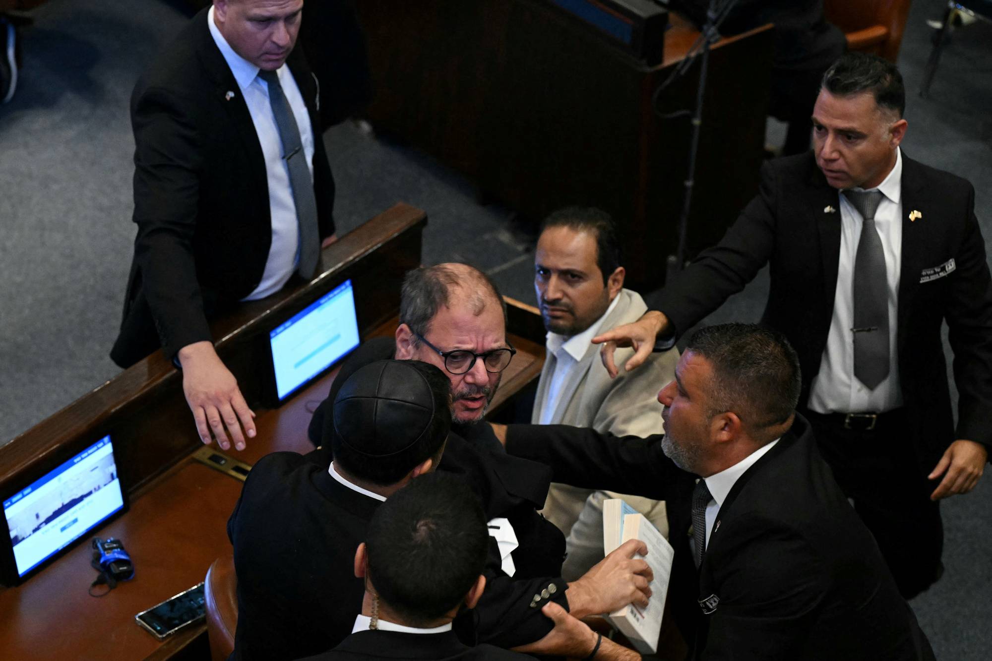 تم إخراج عضو الكنيست الإسرائيلي عوفر كاسيف من المكان بعد أن حمل لافتة أثناء خطاب ألقاه الرئيس الأميركي دونالد ترمب (رويترز)