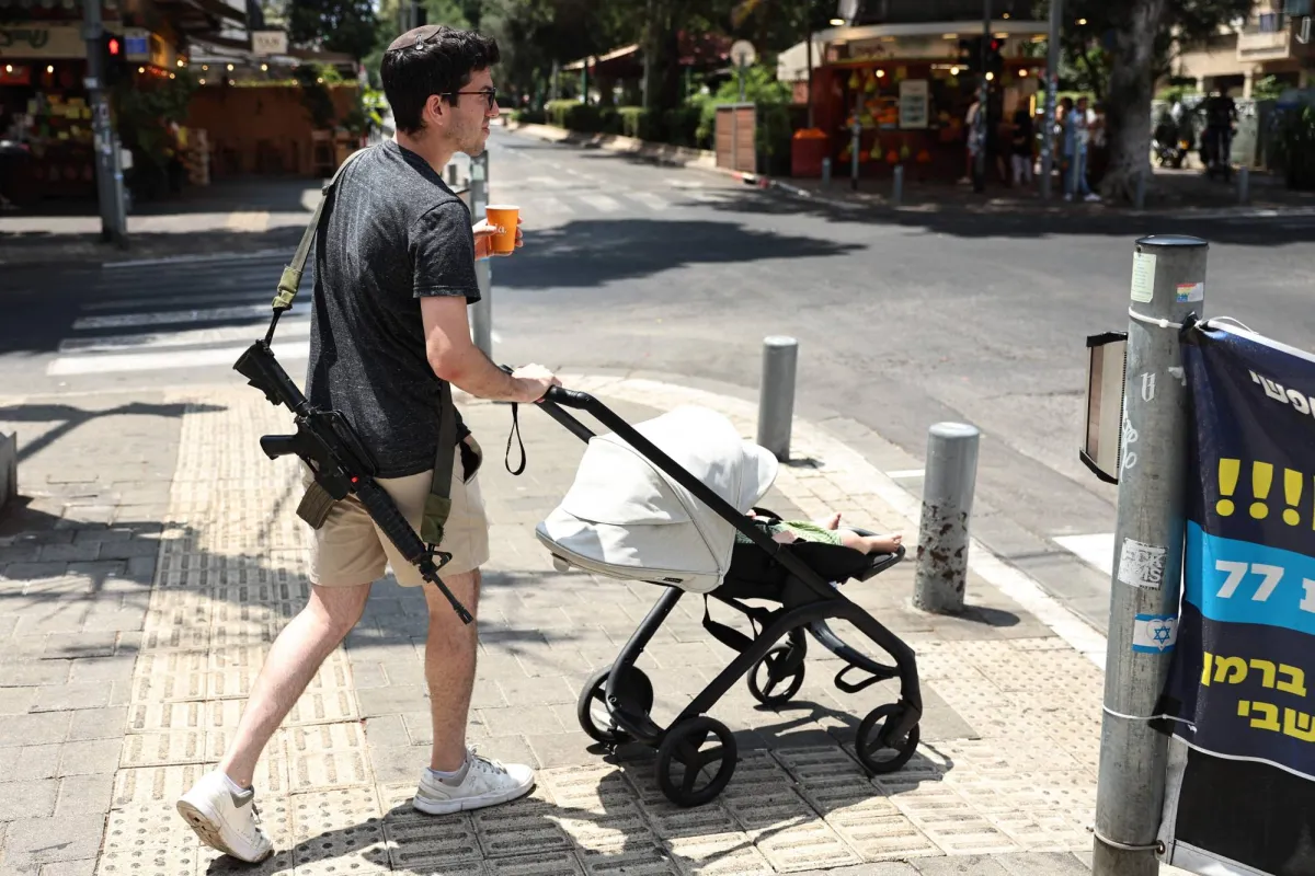 إسرائيلي مسلح يدفع عربة أطفال في تل أبيب (أ.ف.ب)