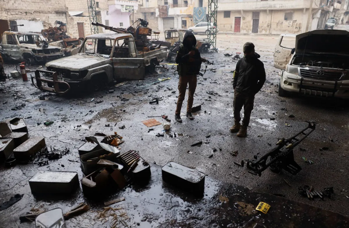 عنصران من قوات الأمن السورية يقفان وسط المركبات المحترقة والذخيرة المتناثرة على الأرص في حي الشيخ مقصود في حلب (أ.ب)