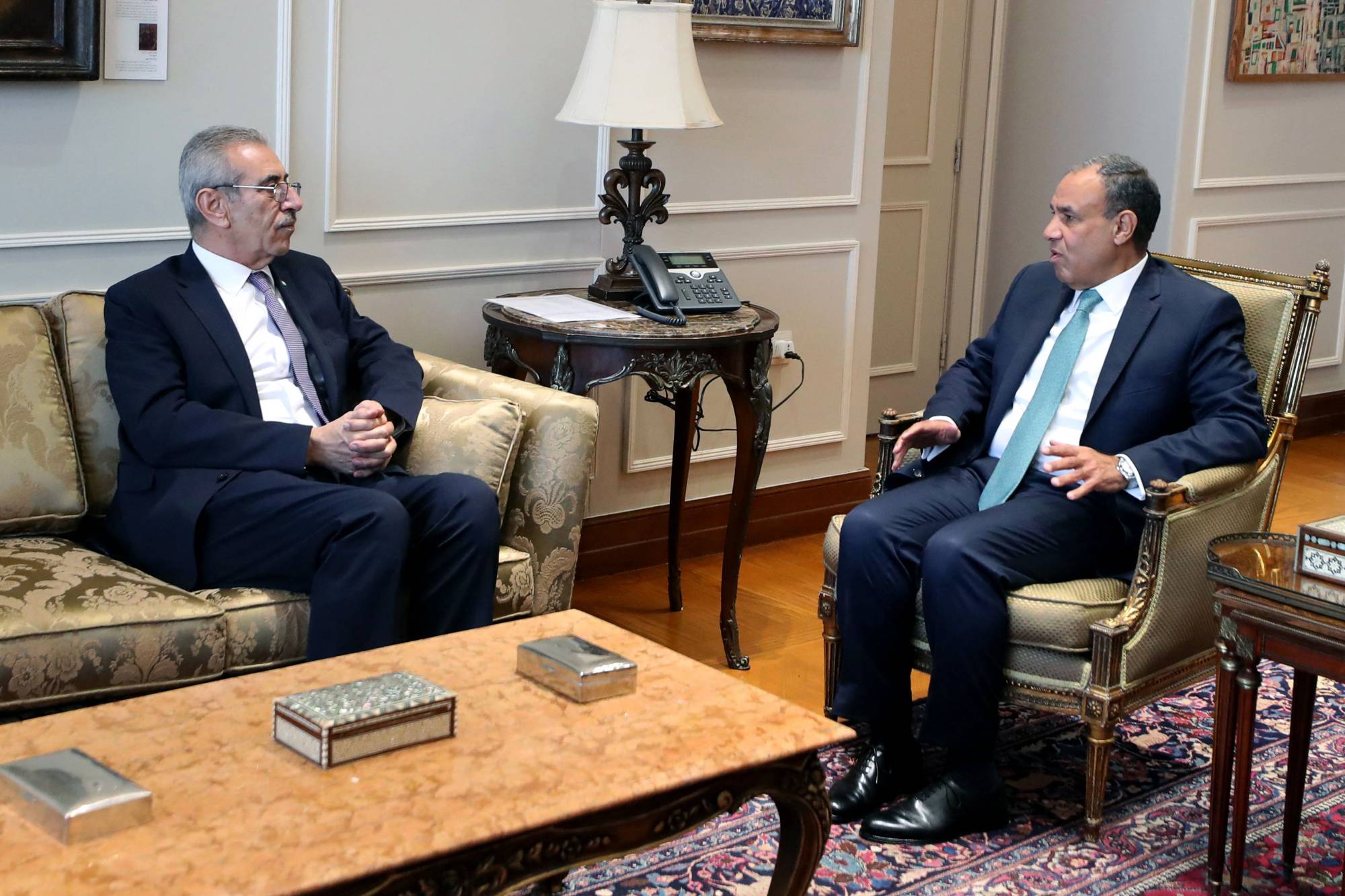 وزير الخارجية المصري بدر عبد العاطي (يمين) خلال لقائه مع علي شعث رئيس اللجنة الفنية الفلسطينية لإدارة قطاع غزة في القاهرة (أ.ف.ب)
