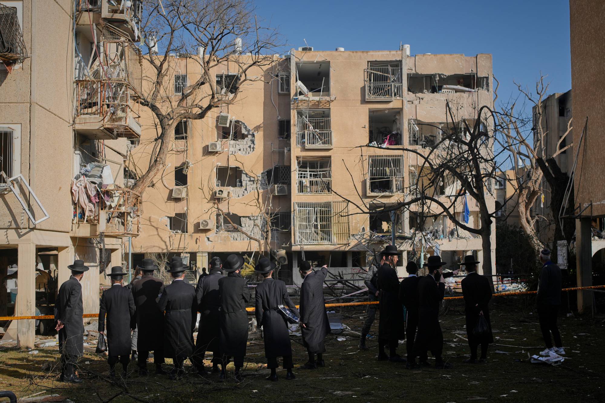 ينظر الناس إلى المباني السكنية المتضررة جراء ضربة صاروخية إيرانية في عراد بجنوب إسرائيل (أ.ب)