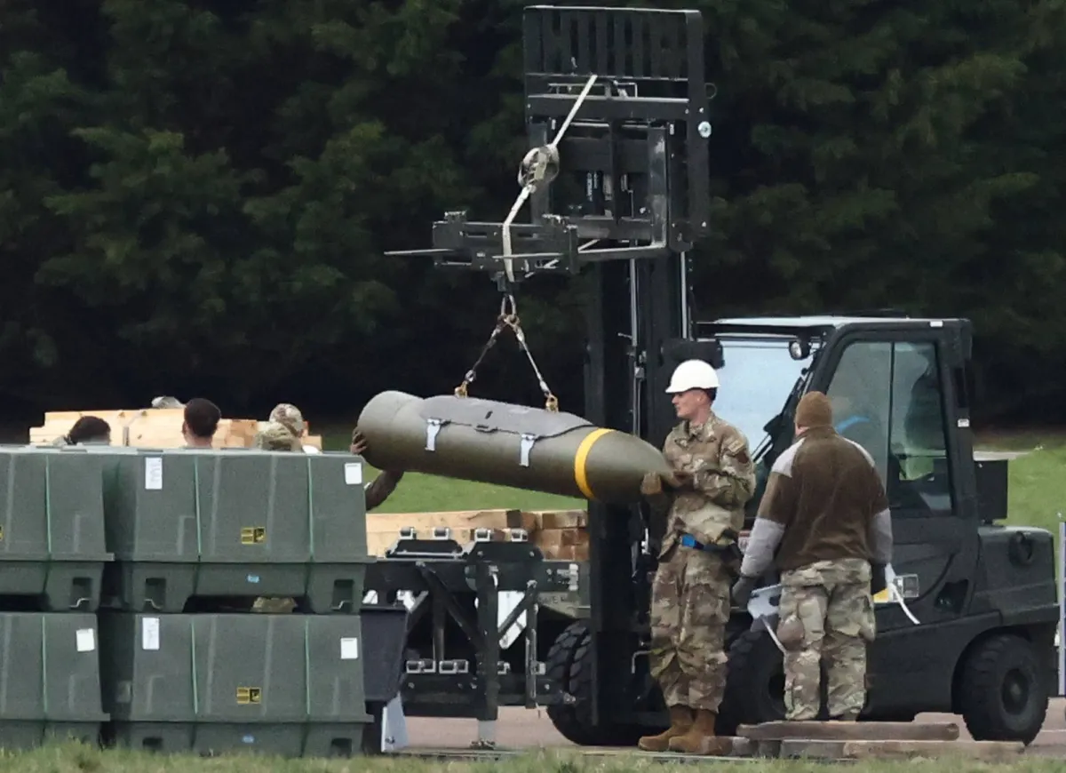 جنود من القوات الجوية الأميركية يعملون في قاعدة فيرفورد الجوية البريطانية على تجهيز قنابل ثقيلة لطائرة قاذفة من طراز «بي 52» تصنعها شركة «بوينغ» (أ.ف.ب)