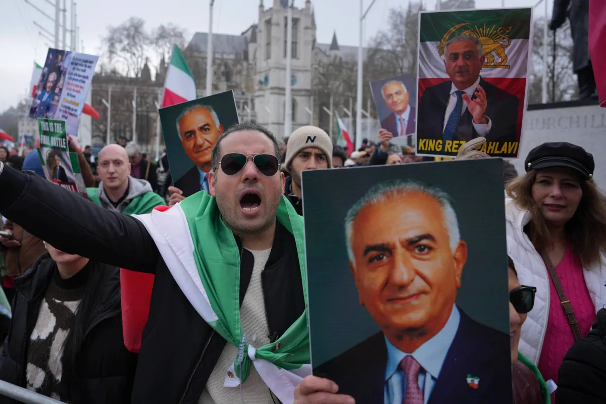 معارضون للنظام الإيراني يرفعون صور رضا بهلوي في لندن (أ.ب)