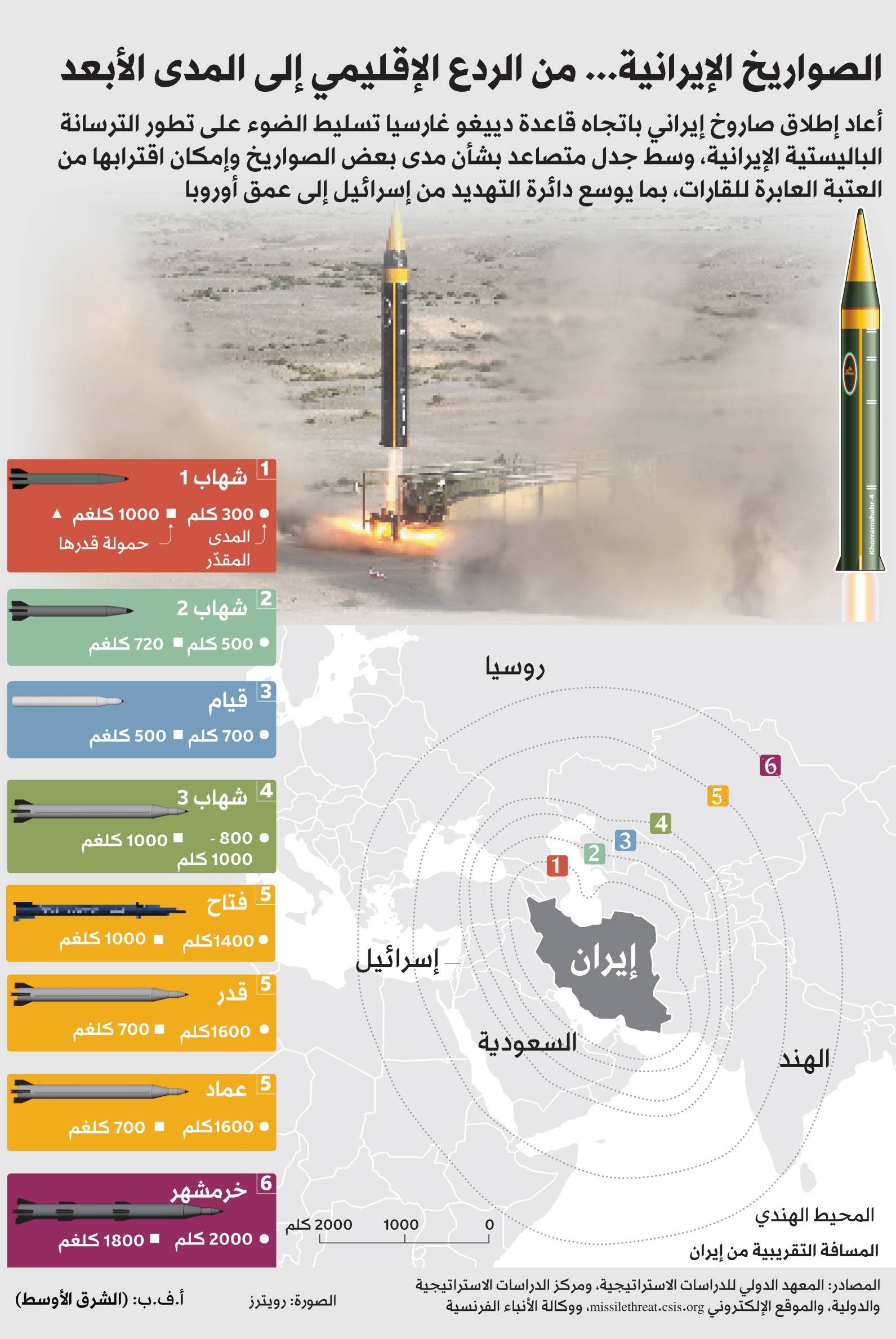 وتعتمد إيران على انتشار جغرافي واسع لمنظوماتها الصاروخية، مع وجود قيادات تشغيلية متعددة. هذا التوزيع يسمح بالحفاظ على وتيرة إطلاق مستمرة رغم تراجع العدد الإجمالي؛ إذ يكفي إطلاق محدود يومياً من مواقع مختلفة لتفادي التعطيل الكامل.