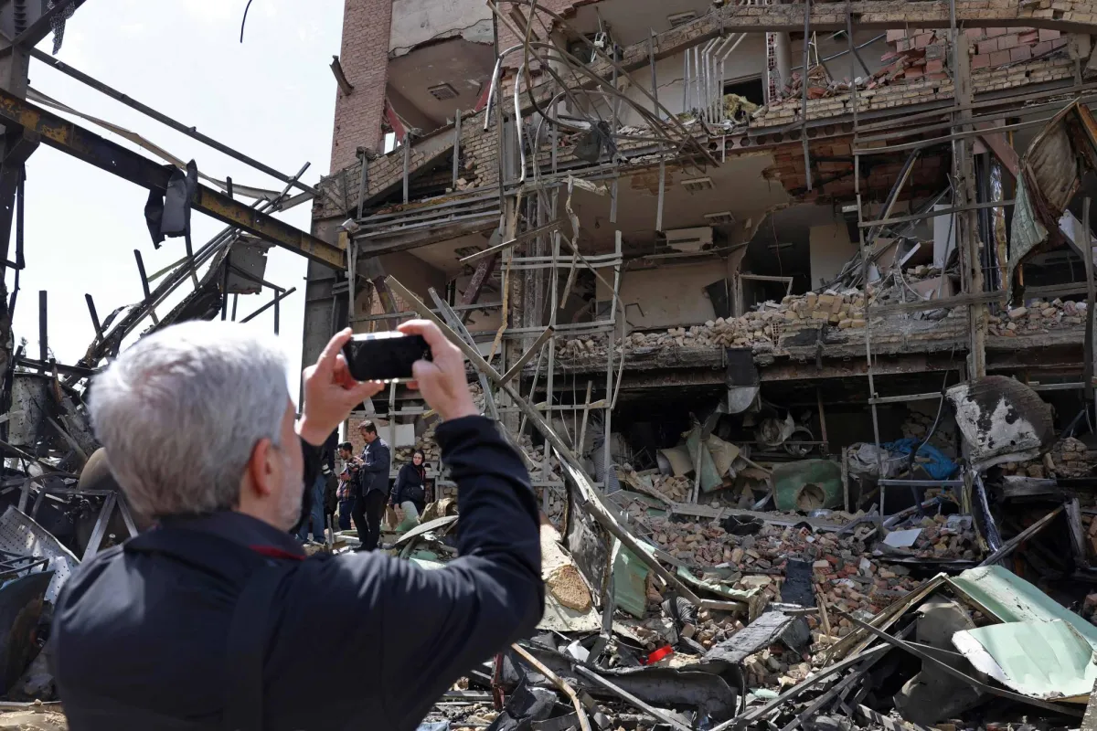 رجل يلتقط صوراً لمبنى جامعة شهيد بهشتي المتضرر عقب غارة جوية في طهران (ا.ف.ب)
