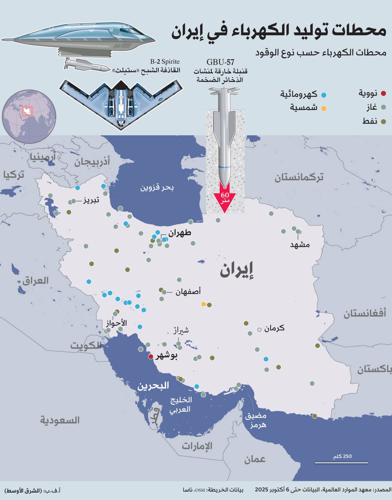 وقال مسؤولان أميركيان لصحيفة «وول ستريت جورنال» إن قاذفات أميركية من طراز «بي - 2» أسقطت، خلال مطلع الأسبوع، قنابل خارقة للتحصينات من طراز «جي بي يو - 57» زنة 30 ألف رطل على مجمع عسكري تحت الأرض تابع لـ«الحرس الثوري» الإيراني.