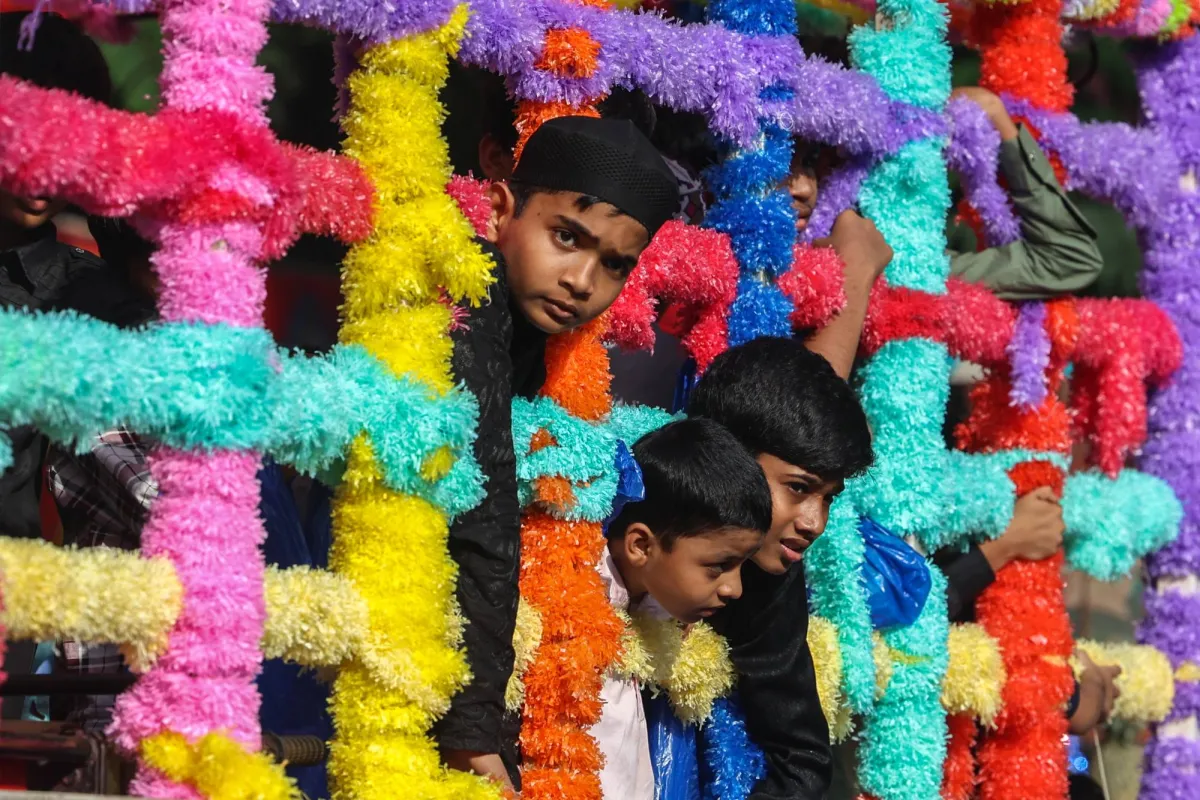 أطفال ينظرون من شاحنة مزينة في الهند (إ.ب.أ)