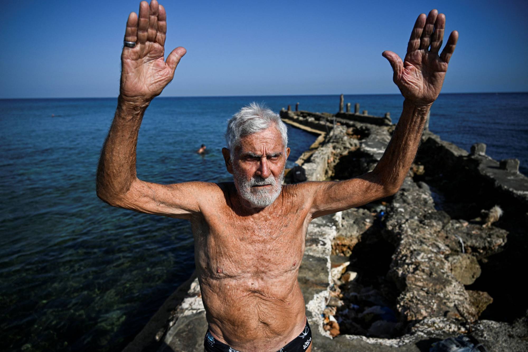 الكوبي أوريستيس كوينتانا (87 عاماً) يتدرب قبل السباحة في هافانا (أ.ف.ب)