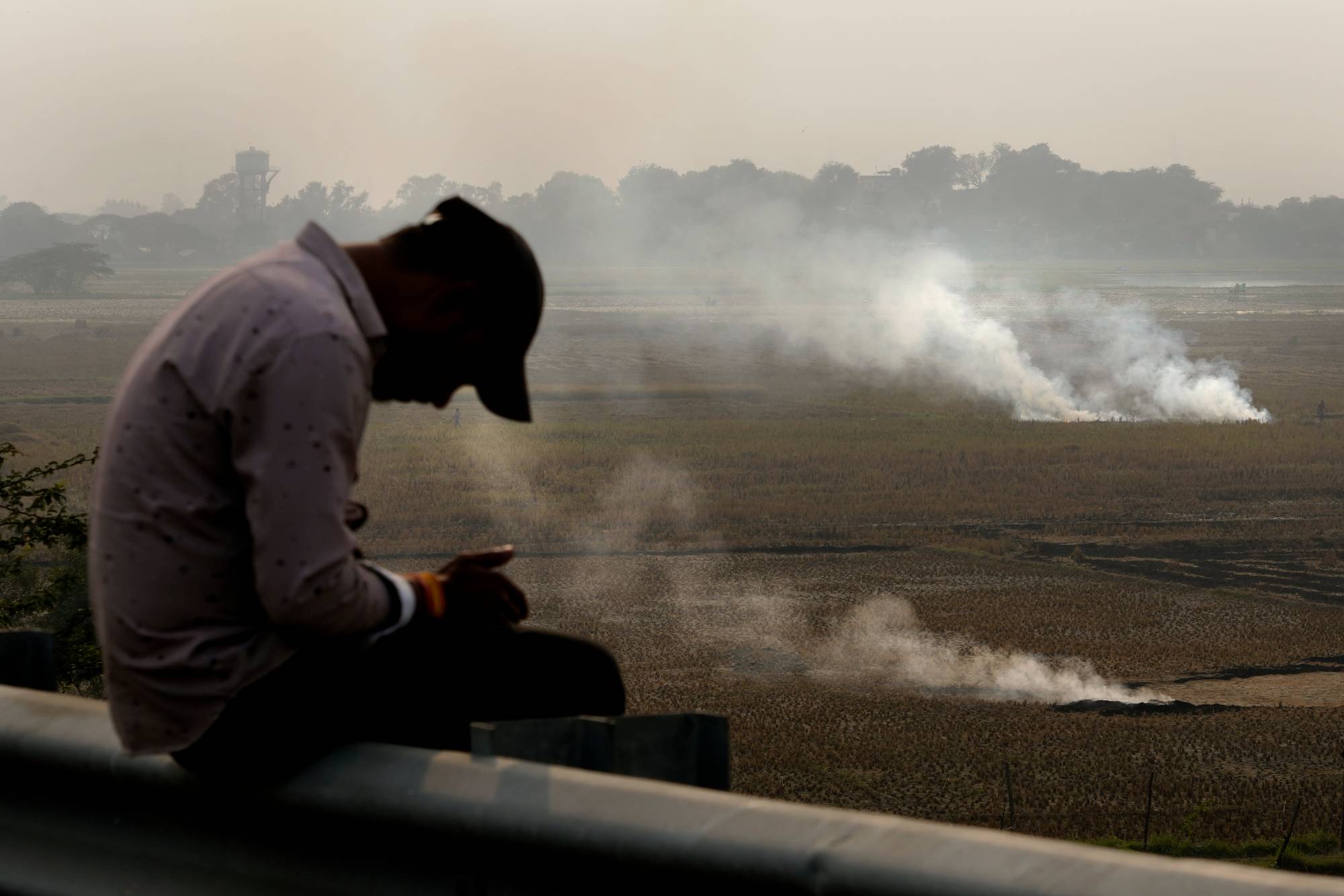 شخص يتفقد هاتفه الجوال بينما يحرق المزارعون بقايا المحاصيل بعد الحصاد بالقرب من طريق سريع في الهند (أ.ب)