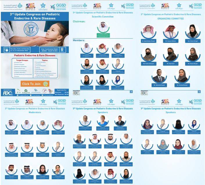 في ظل التحولات المتسارعة في العلوم الطبية، وتزايد الحاجة إلى تبادل الخبرات في مجالات الغدد الصماء والأمراض النادرة عند الأطفال، وترسيخ نهجٍ وقائي واستباقي يُعنى بصحة الطفل منذ مراحله المبكرة، شهدت مدينة جدة صباح يوم 13 نوفمبر (تشرين الأول) 2025 انطلاق فعاليات المؤتمر الثالث للمستجدات في أمراض الغدد الصماء والأمراض النادرة لدى الأطفال (3rd Update Congress on Pediatric Endocrine & Rare Diseases)، والذي يُختتم مساء يوم السبت بجلسة ختامية تتضمن أبرز مخرجات المؤتمر، وتوصياته العلمية.