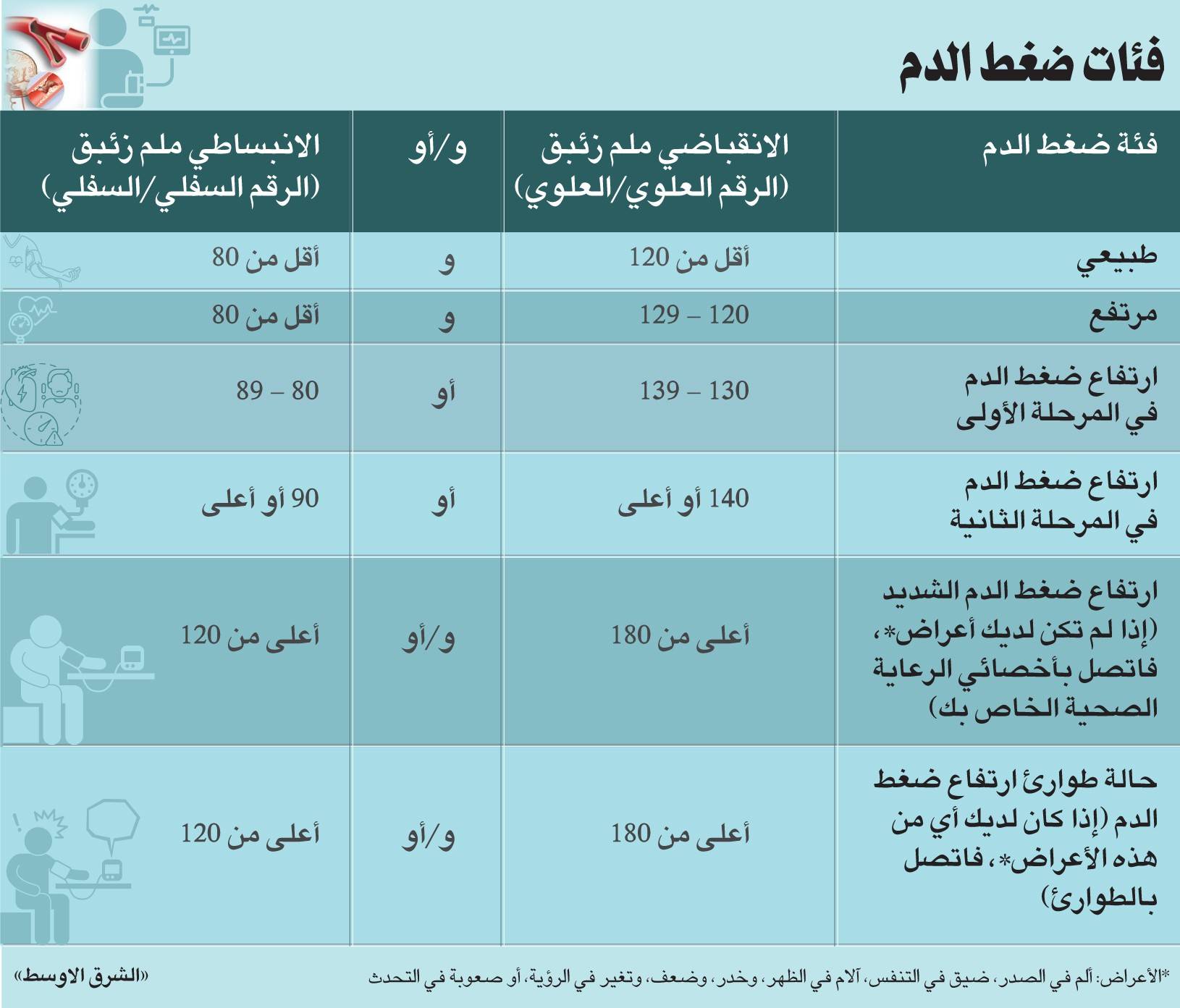 > الفحص بانتظام: يُمكن لأي شخص أن يُصاب بارتفاع ضغط الدم، ولذا يُنصح بفحص ضغط الدم بانتظام. ويشمل ذلك جميع الفئات العمرية، من الأطفال، والشباب، والبالغين، وكبار السن. ويوضح الجدول المرفَق التصنيف الطبي الحديث لمراحل ارتفاع ضغط الدم. وتقول منظمة الصحة العالمية: «ومن بين العوامل التي تزيد من خطر الإصابة بارتفاع ضغط الدم: التقدُّم في العمر، والعوامل الوراثية، وزيادة الوزن والسمنة، وعدم ممارسة النشاط البدني، واتباع نظام غذائي غني بالصوديوم، والإفراط في تعاطي الكحول. ويمكن أن تساعد التغييرات في نمط الحياة -مثل اتباع نظام غذائي صحي، والإقلاع عن تعاطي التبغ، وزيادة النشاط البدني- على خفض مستوى ضغط الدم. ومع ذلك، قد يظل بعض الأشخاص بحاجة إلى أخذ أدوية».
