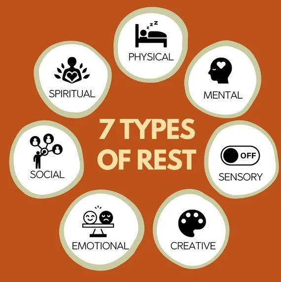 ربما نفترض أن النوم هو النوع الوحيد للراحة التي نحتاجها، لكن ربما يكون لدينا نقص في إحدى الأنواع الكثيرة الأخرى للراحة، التي تعدّ جميعها أساسية وضرورية للتمتع بالقدرة على الإحساس وعلى العمل بأفضل نحو ممكن. واستعرضت الدكتورة سوندرا دالتون سميث في كتابها «سيكريد ريست» «الراحة المقدسة» سبعة أنواع للراحة يستهدف كلُ منها معالجة نوع مختلف من «العوَزْ في الراحة».