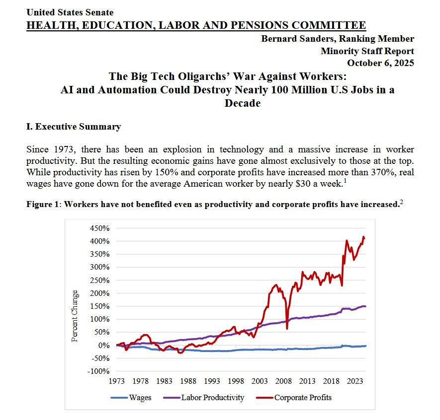 وحمل التقرير عنوان: «حرب كبار الأوليغارشية التكنولوجية على العمال: الذكاء الاصطناعي والأتمتة قد يُدمران ما يقرب من 100 مليون وظيفة أميركية خلال عقد» «Big Tech Oligarchs’ War Against Workers: AI and Automation Could Destroy Nearly 100.Million U.S Jobs in a Decade». وأشرف على إعداده السيناتور بيرني ساندرز.