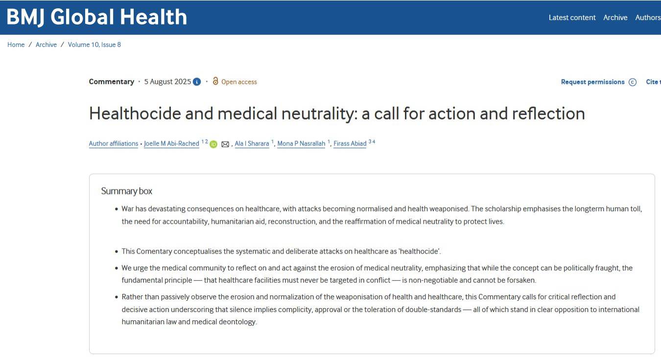 وجاء في المقالة التي اعتمدت على 33 مرجعاً من الدراسات والأبحاث والملاحظات أن واحداً من الإخفاقات الثانية في القانون الدولي هو استمرار استهداف العاملين في مجال الرعاية الصحية والمرافق الصحية، إلى جانب المدنيين، دون عقاب. فقد قُتل أكثر من 1500 من العاملين في مجال الرعاية الصحية، وحوالي ثلث مستشفيات غزة فقط لا يزال يعمل جزئياً فقط. واعتقلت السلطات الإسرائيلية عدة مئات من العاملين في مجال الرعاية الصحية، وتعرّض عدد منهم للضرب والتعذيب والتهديد بالاغتصاب والقتل، وهذه هي «إبادة صحية».