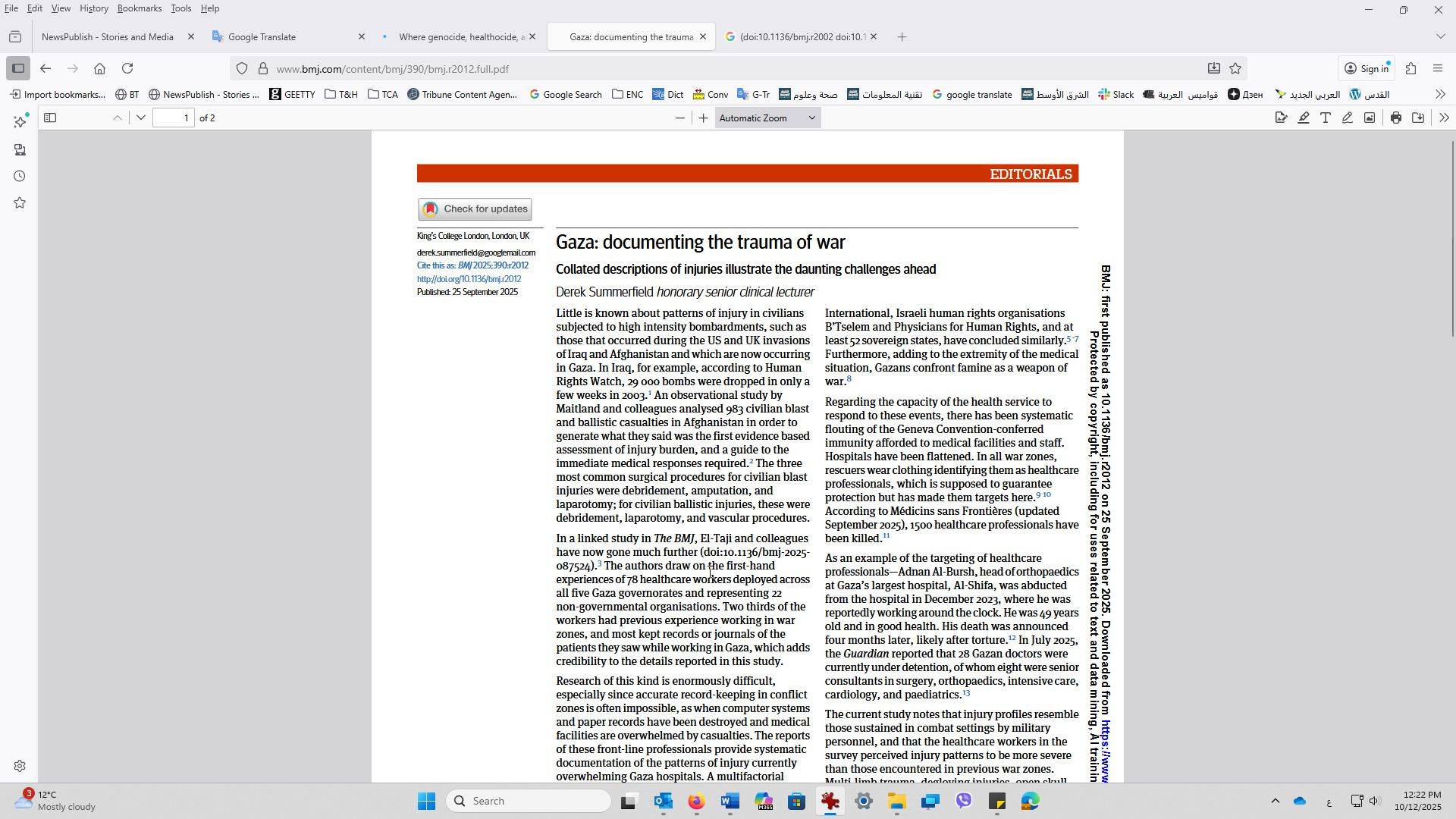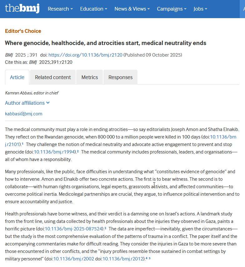 نشرت هيئة تحرير «المجلة الطبية البريطانية» BMJ في التاسع من شهر أكتوبر (تشرين الأول) مقالة كتبها كامران عباسي، رئيس التحرير.