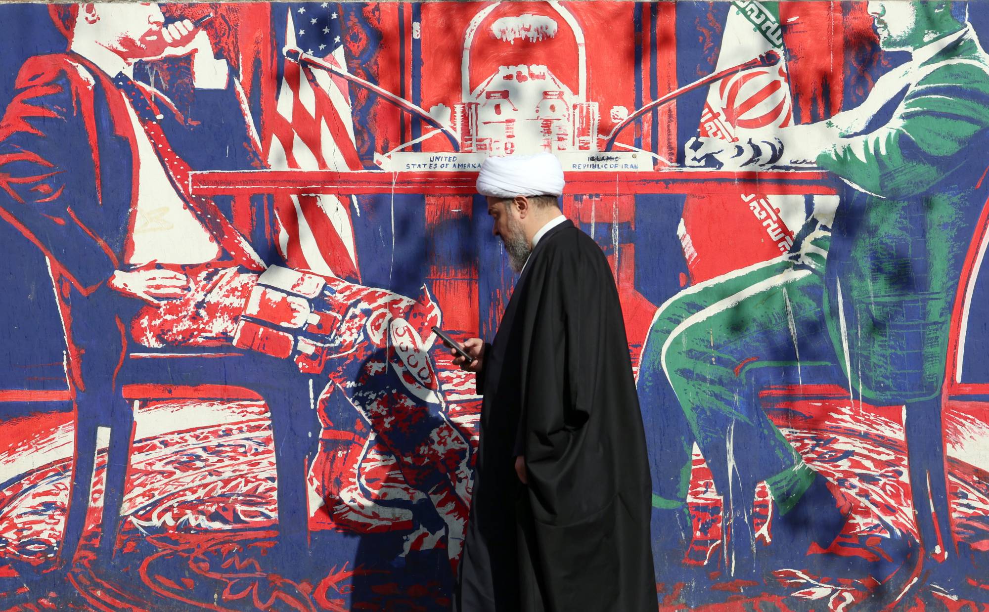 رجل دين إيراني يمر أمام جدارية معادية للولايات المتحدة على حائط سفارتها السابقة في طهران يناير الماضي(إ.ب.أ)