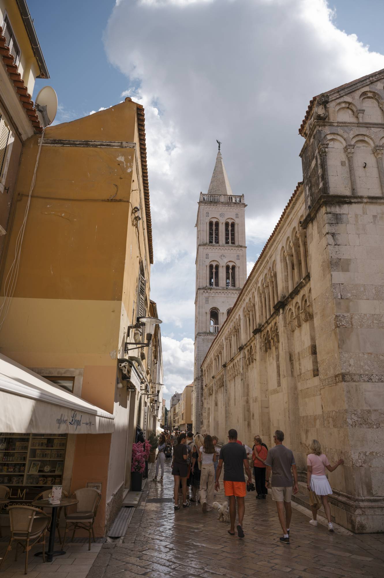 ابدأ رحلتك إلى كرواتيا بالدخول إلى أسوار مدينة زادار التاريخية عبر المدخل الرئيسي، «بوابة الأرض»، التي بُنيت عام 1543 مع منحوتات للقديس كريسوغونوس (شفيع المدينة) وأسد البندقية المجنح. اتجه يمينا إلى «ممر الإمبراطور أغسطس»، وادخل منطقة المشاة، حيث تستقبلك «ساحة الآبار الخمس»، ومتنزه «الملكة هيلينا ماديفكا»، وقاعدة البوابة الرومانية الأصلية. من هنا، سر في شارع زادار الرئيسي الذي يعود تاريخه إلى 2000 عام، والمعروف باسم «كالي لارغا»، وصولاً إلى كاتدرائية «القديسة أناستاسيا» الرومانية، التي بُنيت على أساسات تعود إلى القرن الرابع، وتضم رفات شفيعتها التي سُميت باسمها. بعد ذلك، اصعد برج الجرس الذي يبلغ ارتفاعه 184 قدماً (يُتاح الدخول المجمع للكاتدرائية والبرج) للاستمتاع بإطلالة بانورامية رائعة ونظرة عامة على مغامرة عطلة نهاية الأسبوع.