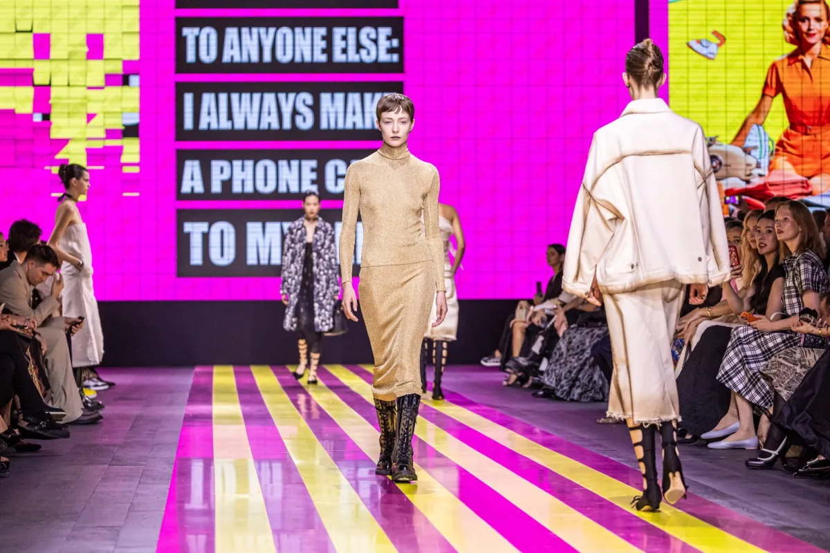 من خلال سينوغرافيات تتوالى فيها شعارات تصب كلها في المعنى نفسه مثل «الرأسمالية لن تأخذها إلى حيث تريد حقاً»، و«ليست هي... لم تعد كما كانت في السابق»، وغيرها من لوحات تُعبر عن رفضها للأفكار النمطيّة التي تحصر النساء في صور مُحدّدة، توالت الإطلالات والاقتراحات التي لم تتجاهل فيها المصممة أن الرأسمالية جزء مهم في عملية بيع الموضة، الراقية تحديداً. البيان الذي وزعته الدار أشار إلى أن التشكيلة «أبصرت النور نتيجة التأمّل في معنى الحاضر. وهو حاضر يحث على التعايش ما بين الماضي والمستقبل بشكل متناغم». لكن هذا التناغم كان أساسه تناقض كبير بين الشعارات الثائرة على الوضع الحالي بمفهومه الرأسمالي، الذي ندّدت به إيلينا بلانتوني، وما تقوم عليه الموضة من حاجة لبيع منتجات باهظة الثمن لرأسماليين.