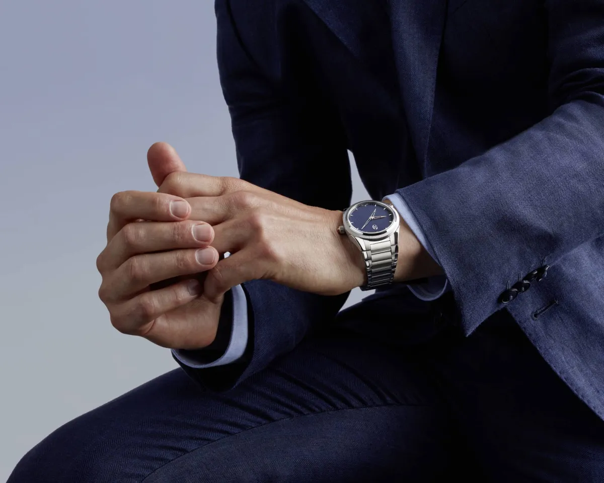وتبدو الساعة متواضعةً للوهلة الأولى، مع عقربين للساعات والدقائق يطوفان برشاقة حول الميناء، ولكن في قلبها يكمُنُ تعقيدٌ ساعاتي يُشغِّل عقربَين متراكِبَين؛ أحدهما من الذهب المطلي بالروديوم للتوقيت المحلي، والآخر من الذهب الوردي عيار 18 قيراطاً لتوقيت الموطن.