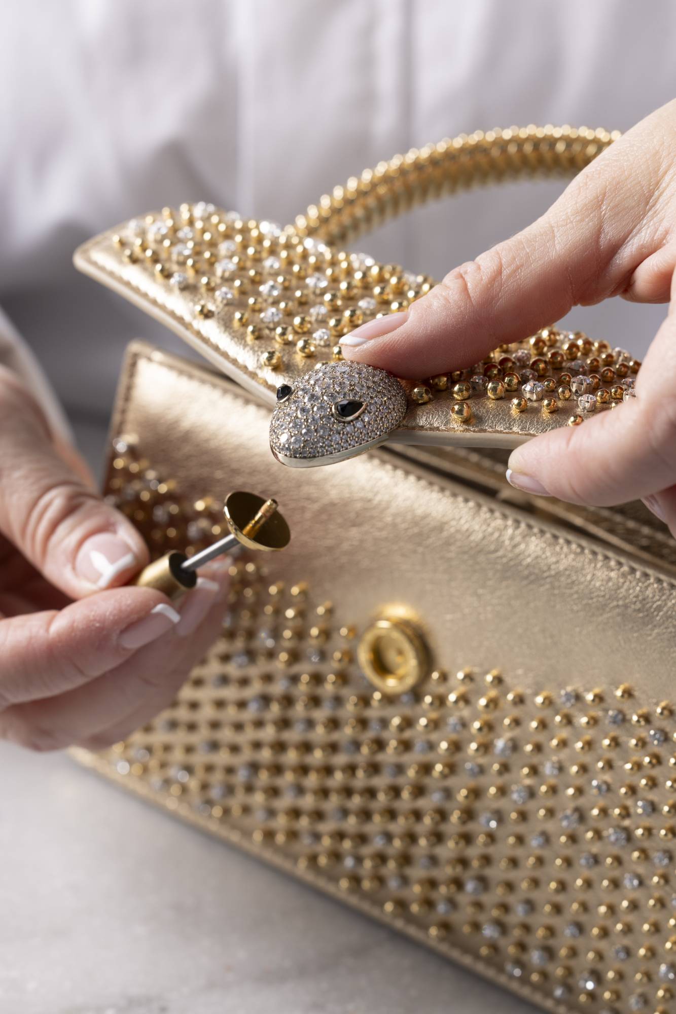 حقيبة جينكو الصغيرة هي الأخرى بتصميم مرصع يدوياً على شكل ندف الثلج من أحجار الكريستال البلاتيني باللون الذهبي، بينما لا تفتقد حقيبة ماركيز من تشكيلة ديفاز دريم بشكلها البيضاوي عنصر الإثارة من ناحية تصميمها الغارق في عالم المجوهرات، إلى جانب حقيبة سيربنتي باليني بمقبضها الحصري المكون من 55 عنصراً معدنياً يترصع كل منها بسبع خرزات.