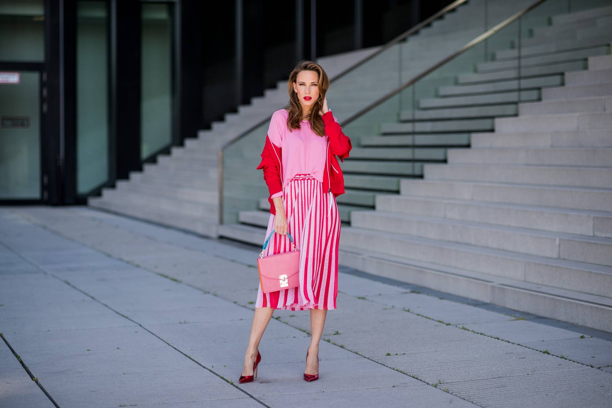 المؤثرة ألكسندرا لاب تلبس تنورة من «مارك كاين» ببليسيهات ذكية تتداخل مع خطوط مستقيمة لخلق خدعة بصرية بالطول (غيتي)