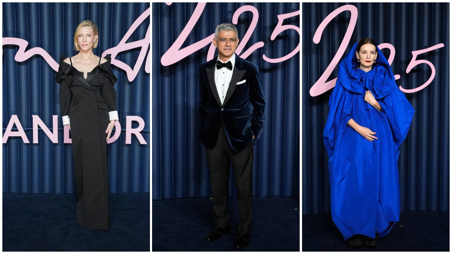 عمدة لندن صادق خان يتوسط المصممة روكساندا والنجمة كيت بلانشيت لدى وصولهم الحفل (رويترز - أ.ف.ب)