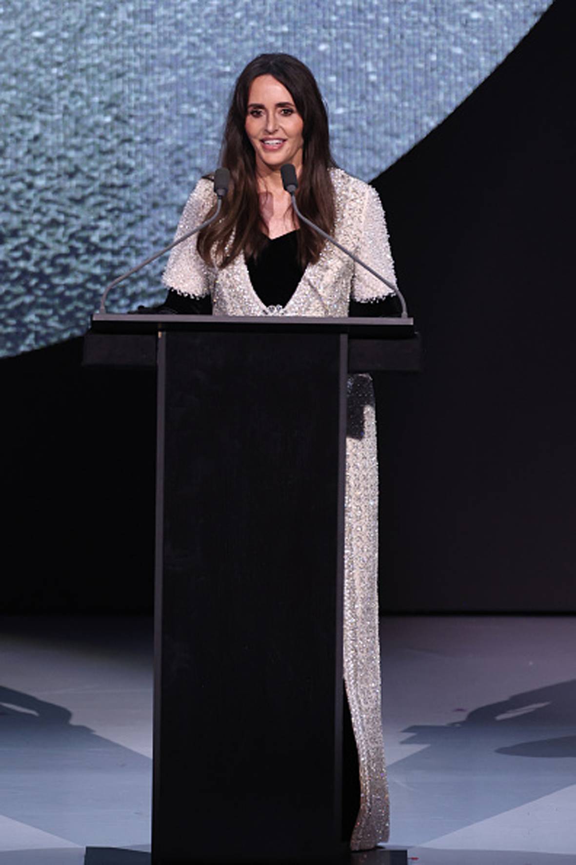 لمسات الموضة تانيا فارس خلال تلقي كلمتها بعد حصولها على جائزة تقدير على إسهاماتها في دعم المصممين الناشئين (غيتي)