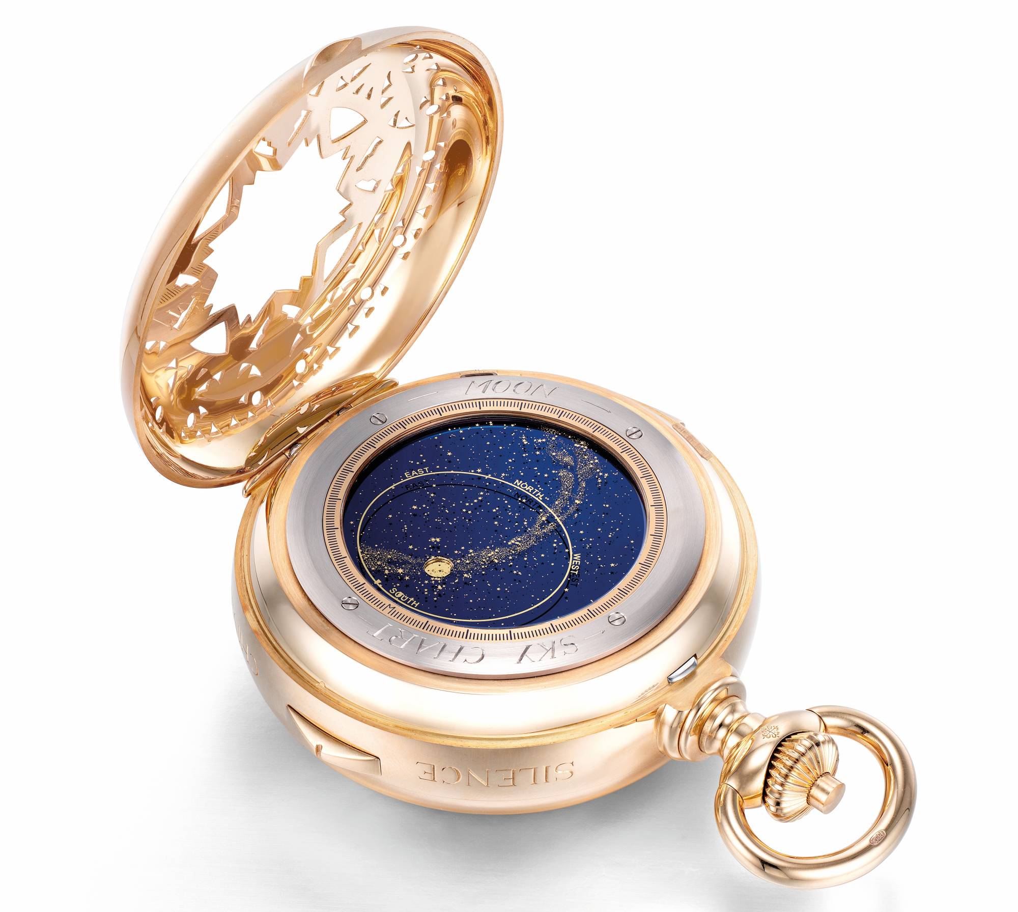 6- تتمتع الساعة بآلية تتيح تحديث كل مؤشرات التقويم، بما في ذلك الشروق والغروب ومعادلة الوقت. بلمسة واحدة على الزر، ويمكن تصحيح جميع مؤشرات التقويم دفعة واحدة لنحو شهر من التوقيت. وبدلاً من مؤشرات فرعية تقليدية، تعرض الساعة السماء بنجومها والقمر بحركته بدقة غير مسبوقة في ساعات الجيب.