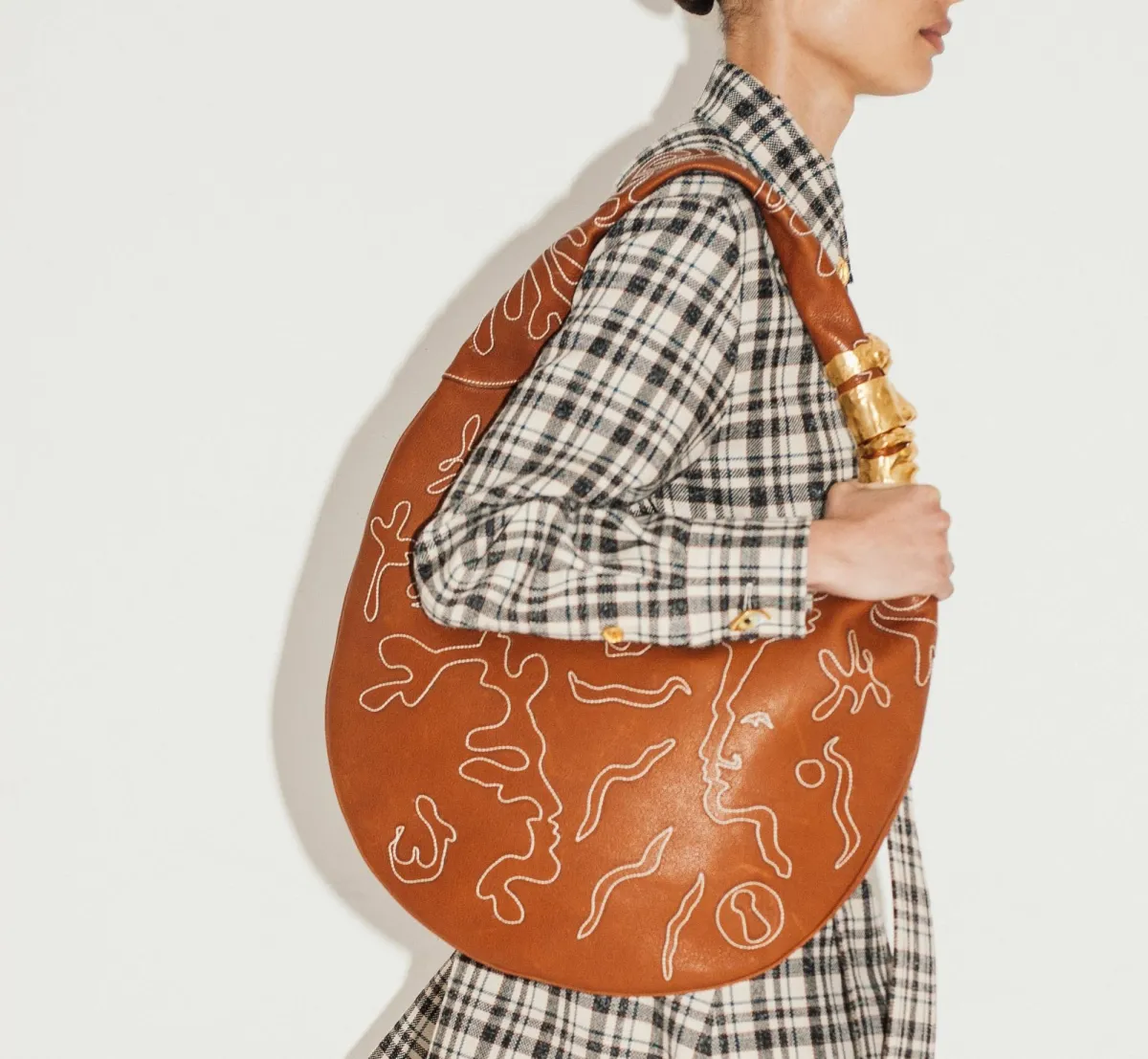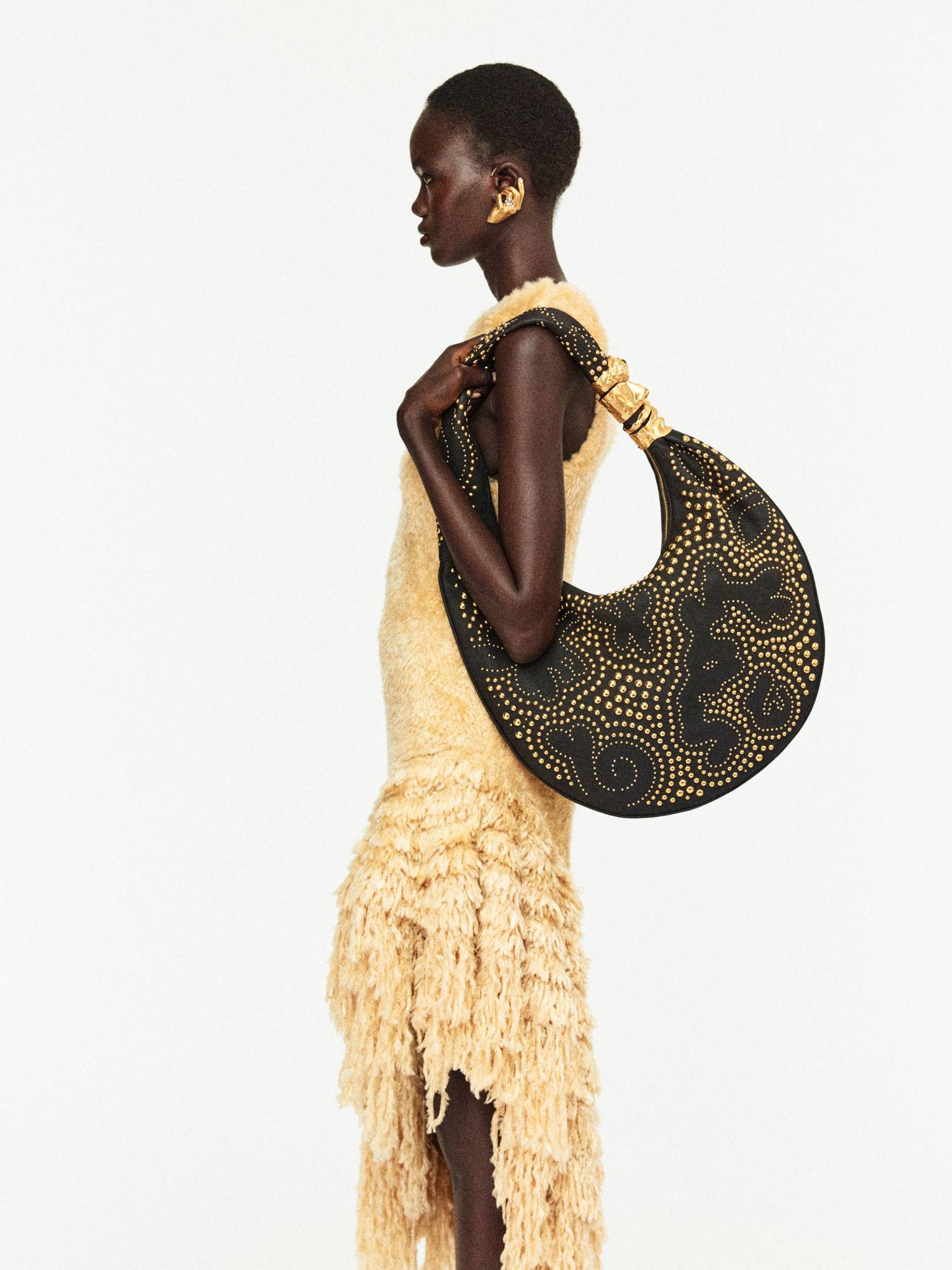 نعم، تجمع الطابع العملي من ناحية الشكل الانسيابي والخامات المرنة، لكن الطابع الفني، وتحديداً السريالي، لم يغب. يظهر في زخرفات تُغني عن أي «لوغو» يُمكن اعتماده للتعريف باسم الدار. فإضافة إلى التطريزات والترصيع الذي شمل بعض الحقائب، تُزين مسكة الحقيبة عين واسعة يأتي تحتها أنف ضخم وشفاه مكتنزة من المعدن الذهبي.