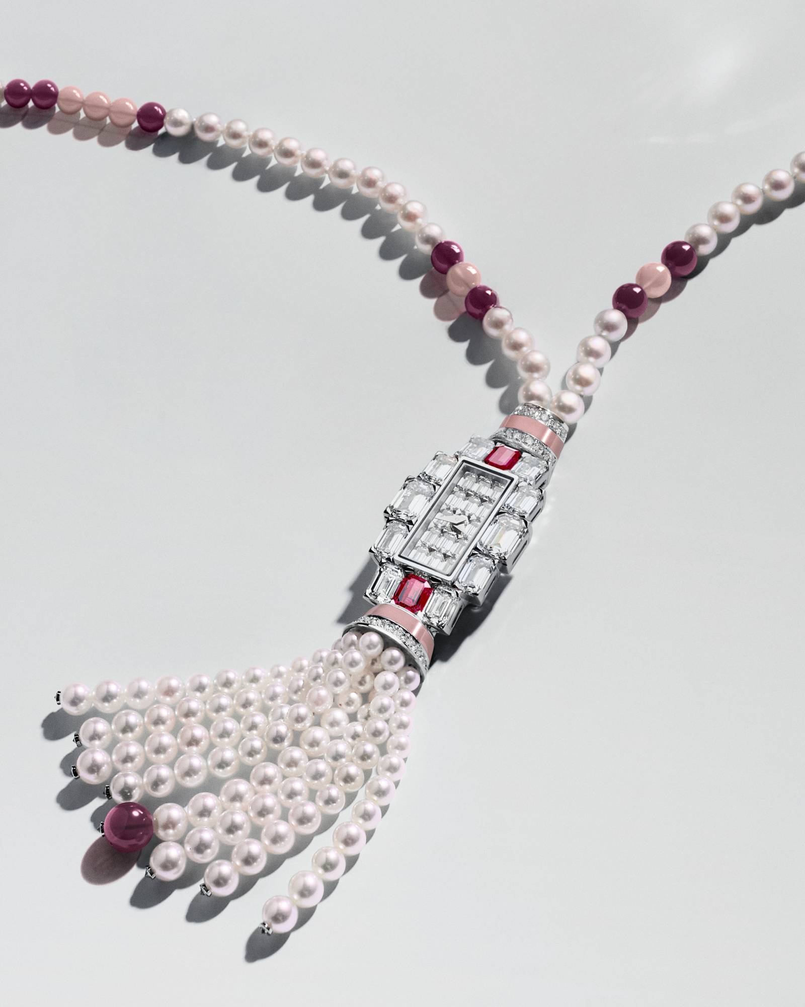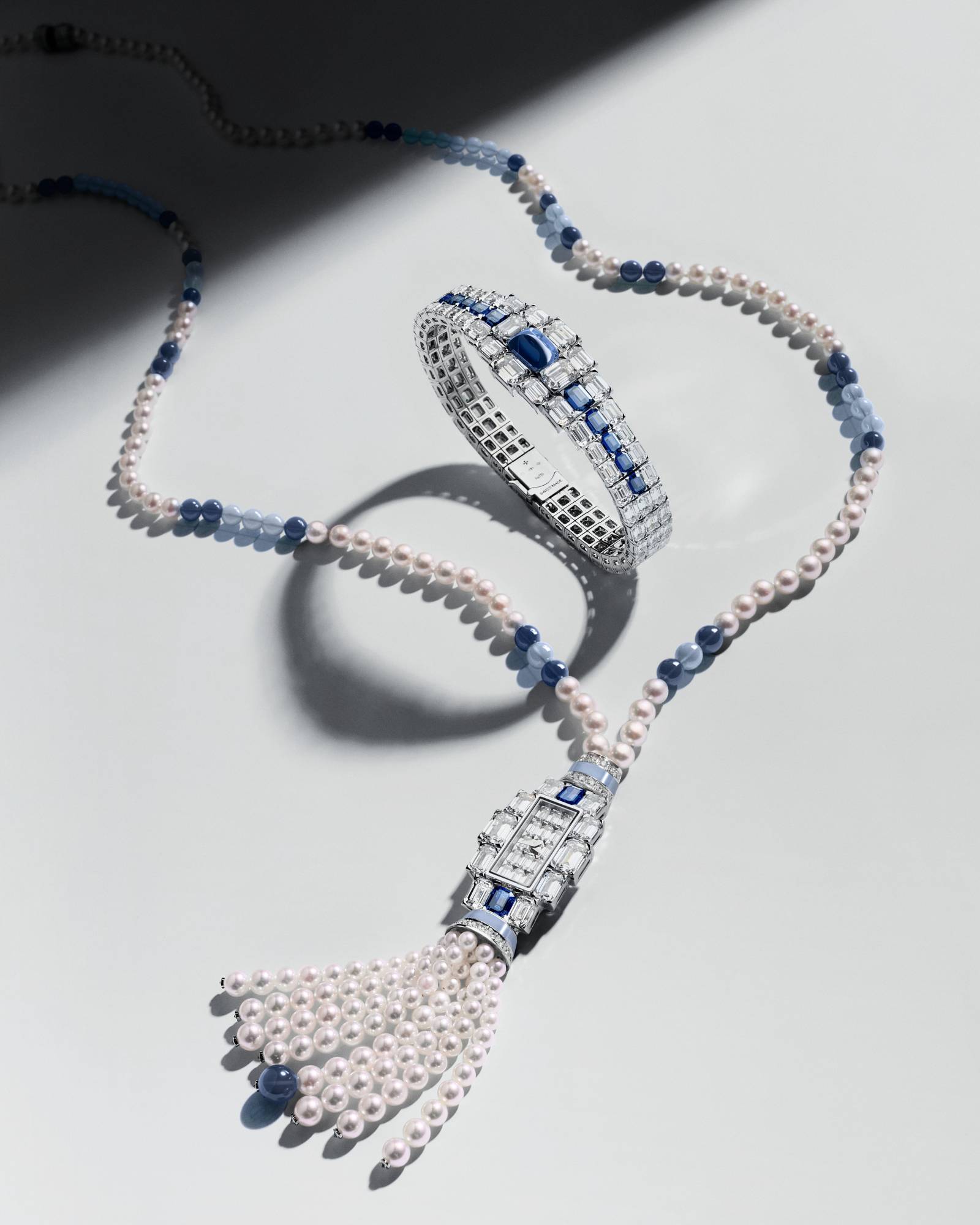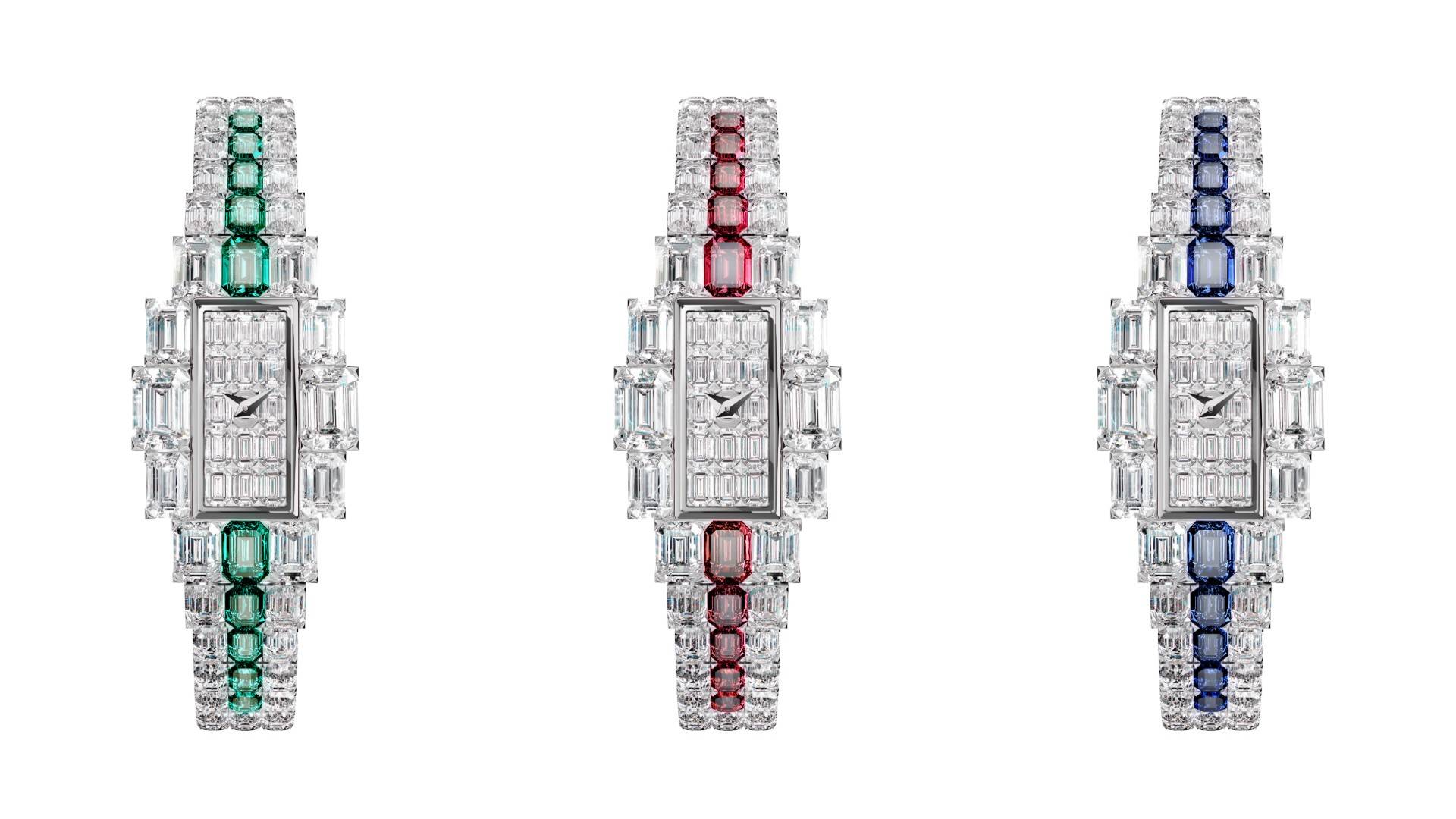 كل ساعة تنقسم إلى أربع تحف قابلة للتبديل: ساعة مرصّعة بالكامل، وقطعة مجوهرات، وسوار ريفييرا بثلاثة صفوف، وعقد سوتوار طويل.