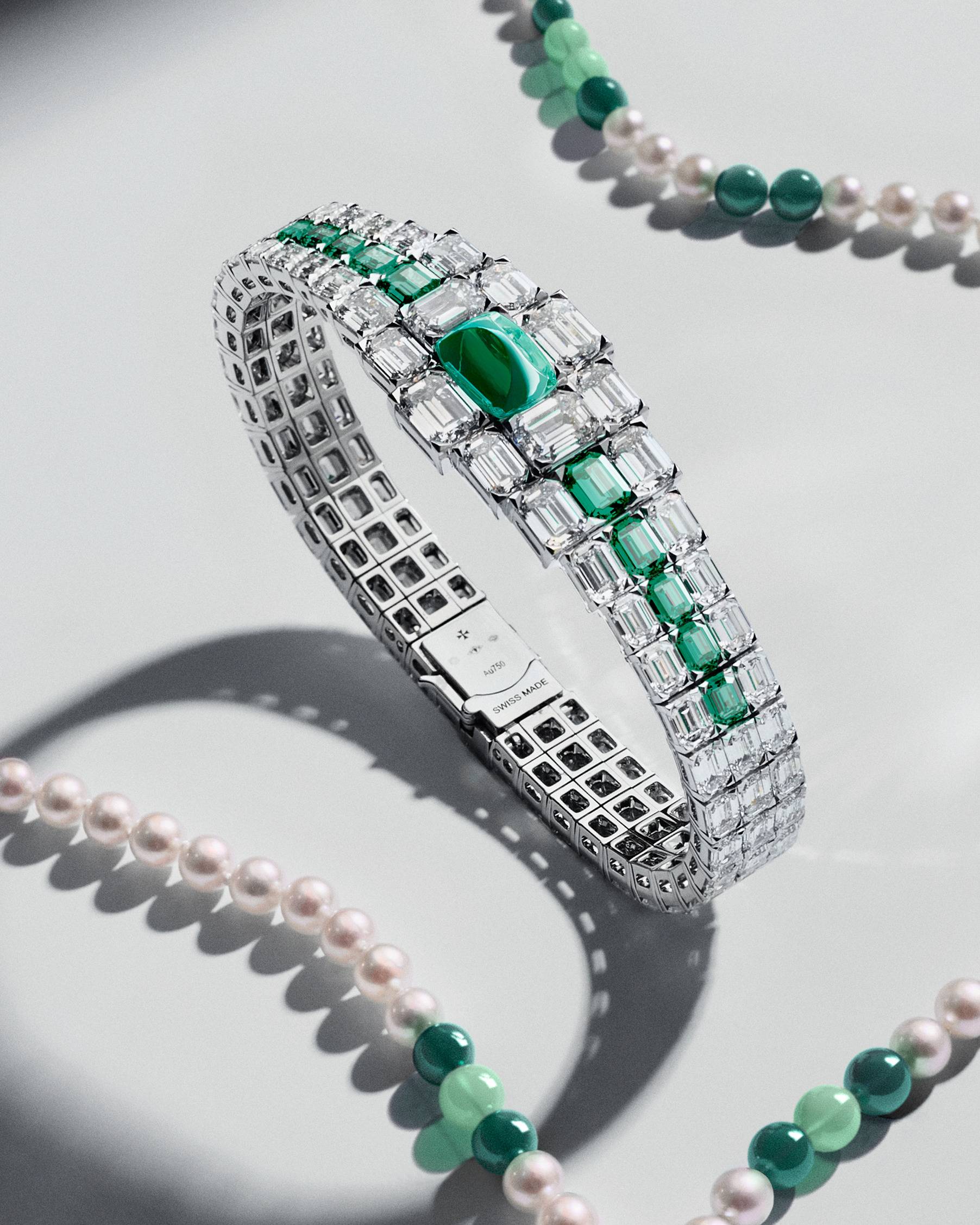 في هذه الإصدارات، تنبض واحدة بالماسات البيضاء إلى جانب الزمرّد في إطار من البلاتين، وتتوهّج في أخرى مع الياقوت أو السافير في ذهب أبيض براق. كما تتناغم هذه الأحجار الكريمة مع لآلئ أكويا البيضاء وخرز من الأحجار المصقولة.
