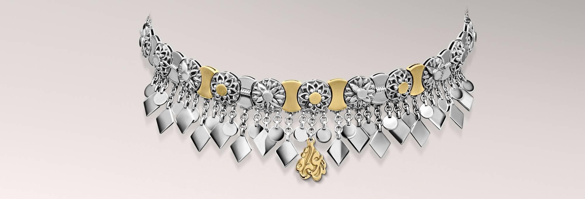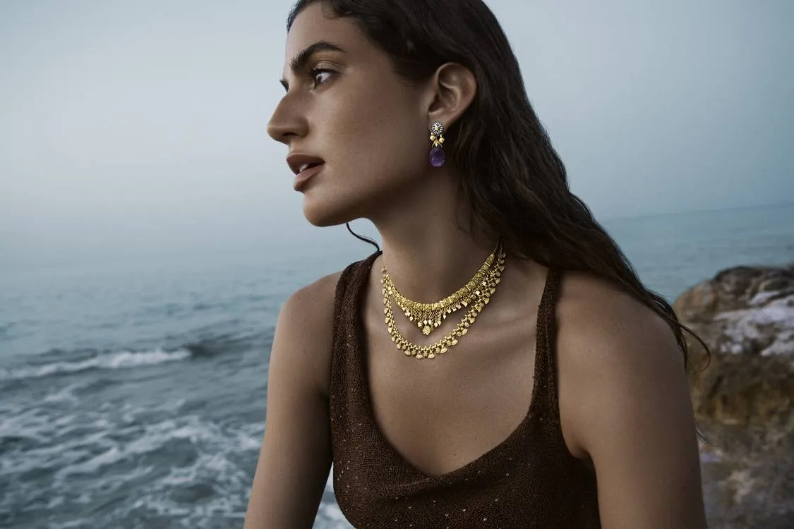 من أبرز القطع في المجموعة مثلاً، قلادة «حديقة السعادة»، مصنوعة من الذهب ومزخرفة بأزهار اللوتس، تم نقشها يدوياً وبحرفية عالية لتشكل طوقاً يزين الرقبة بأناقة. لكن ليس هذا وحده ما يثير فيها: تتوسطها كلمة «سعادة» مكتوبة بالخط العربي.
