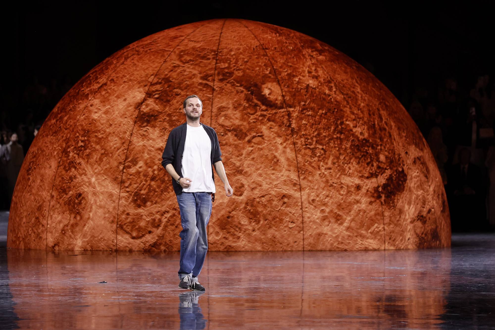 المصمم ماثيو بلازي بعد انتهاء عرضه (إ.ب.أ)