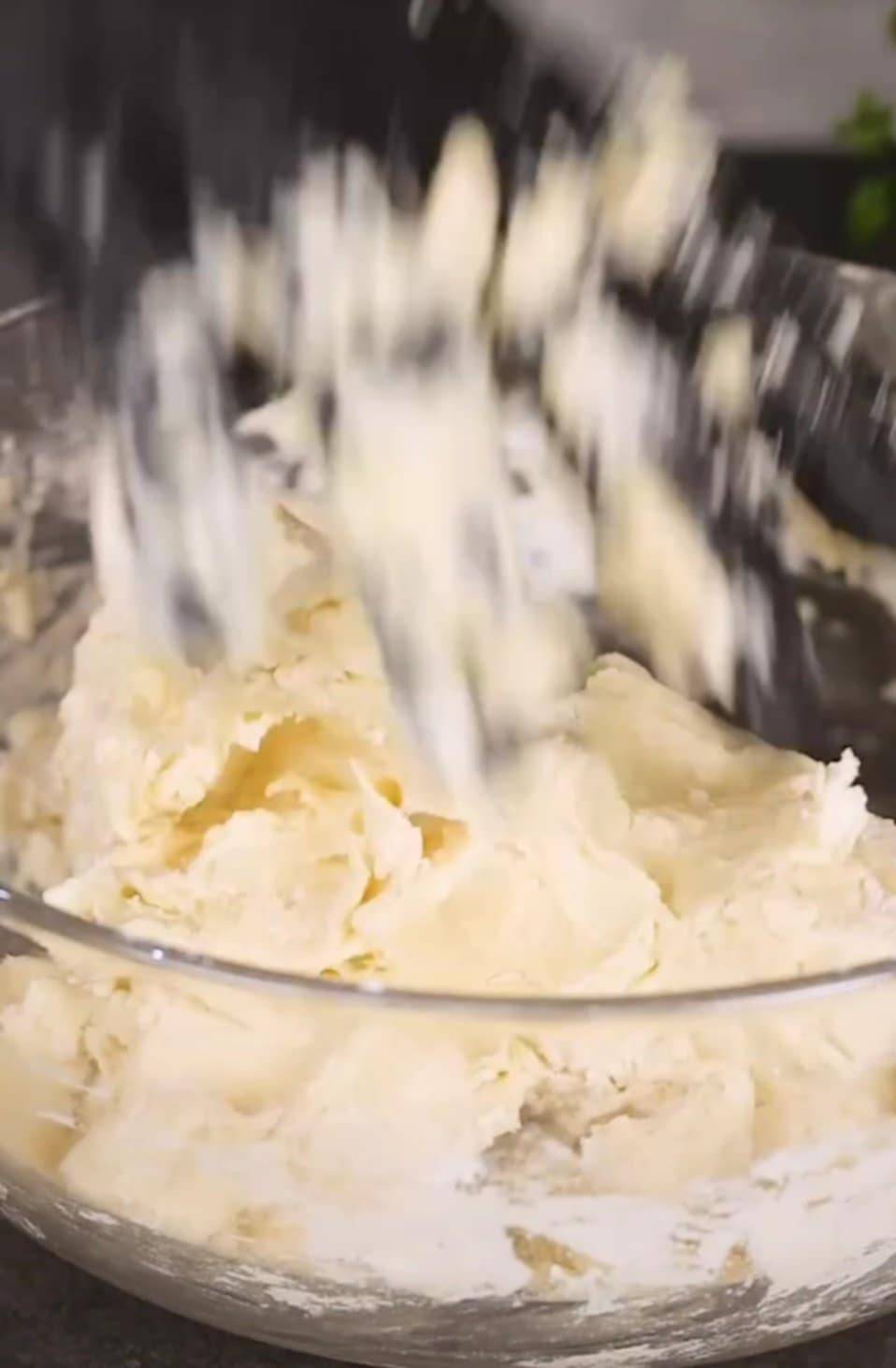 تُضاف البطاطس المهروسة ويستمر التقليب حتى يصبح الخليط ناعماً.