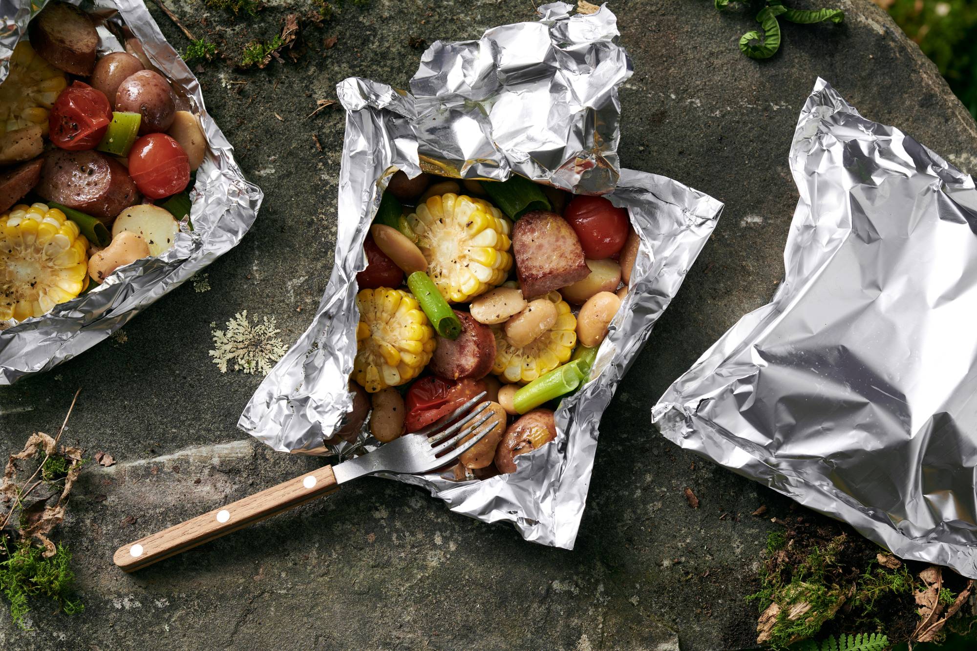 عندما تكون في رحلة تخييم، يمكن أن يكون كيس رقائق الألمنيوم — وهو عبارة عن مغلفات من رقائق الألمنيوم تحتوي على المكونات — مفيداً بشكل خاص. إنه في الأساس جهاز طهي بالبخار لوجبة واحدة؛ لذا يمكن تغليف أي شيء يمكن طهيه بالبخار في ورق من رقائق الألمنيوم. وعندما تكون جاهزاً للطهي، كل ما عليك فعله هو وضع الكيس على الفحم أو شبكة الشواء.