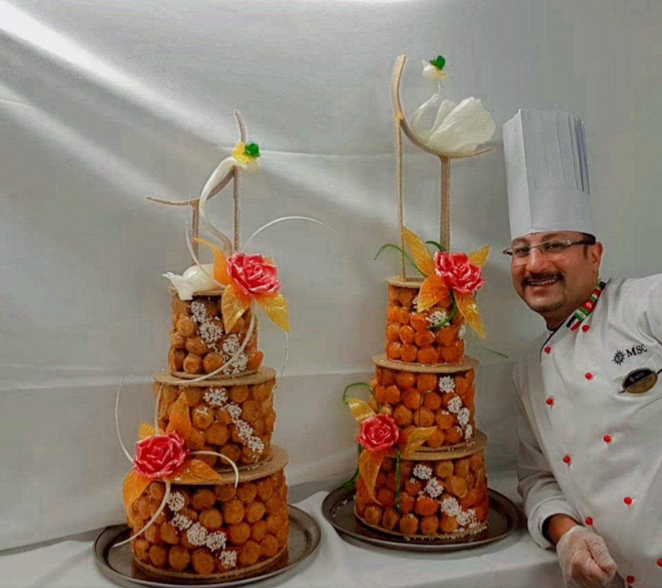الشيف أحمد عبد السلام مع حلوى كروكمبوش المغطاة بالكراميل (الشرق الأوسط)