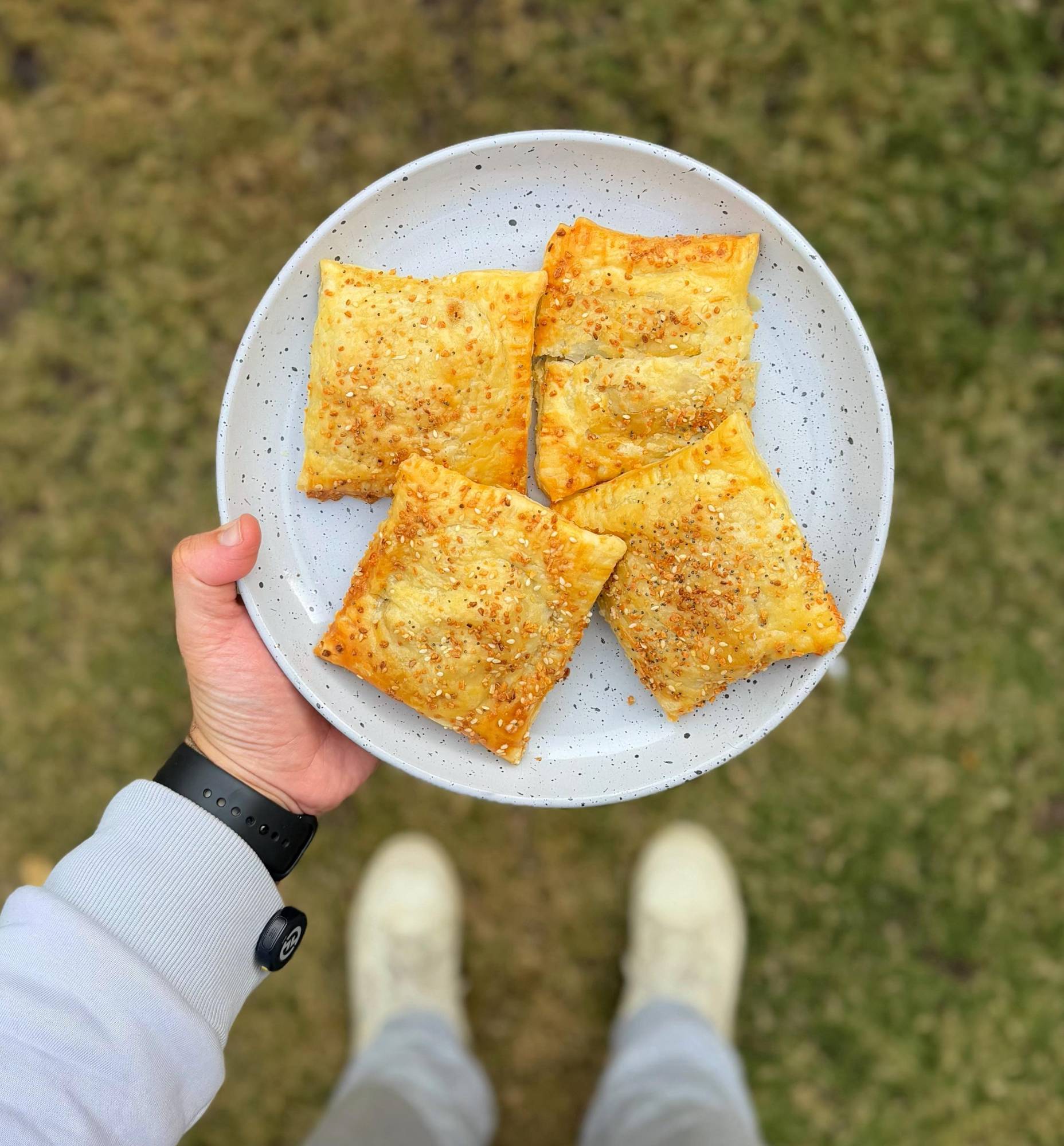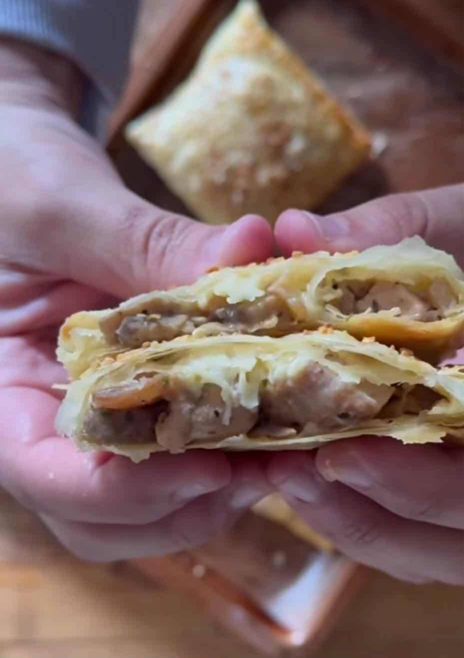 بعدها تُستخدم شرائح من عجينة الفطير، وتُفرد على سطح مرشوش بالدقيق، ويوضع الحشو في المنتصف بعيداً عن الأطراف، وتُضاف جبنة البارميزان ورشَّة ماء وزبدة، ثم تُغلق الفطيرة من الجوانب بشوكة، وتُرَش بالسمسم أو حبة البركة، وتُخبز في فرن بدرجة 200 مئوية حتى تصبح مقرمشة.
