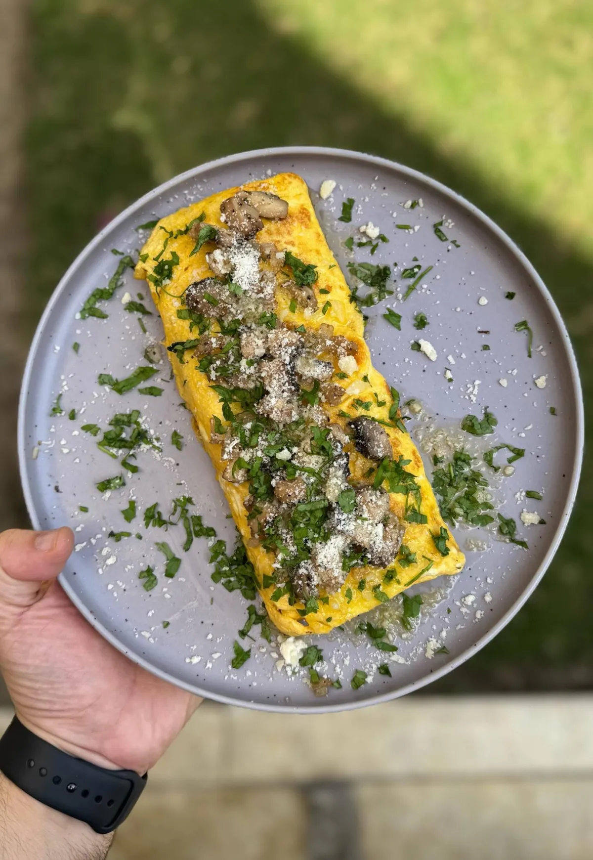 بعد ذلك، توضع الزبدة في طاسة على النار، وبعد ذوبانها يُضاف البيض المخفوق مع الملح والفلفل، ثم يُوزع صوص المشروم، ويُضاف الجبن و«ترافل داست»، ويُغلق الأومليت من الجوانب، ويُضاف على الوجه المشروم الذي تم تركه جانباً مع جبن البارميزان والبقدونس.